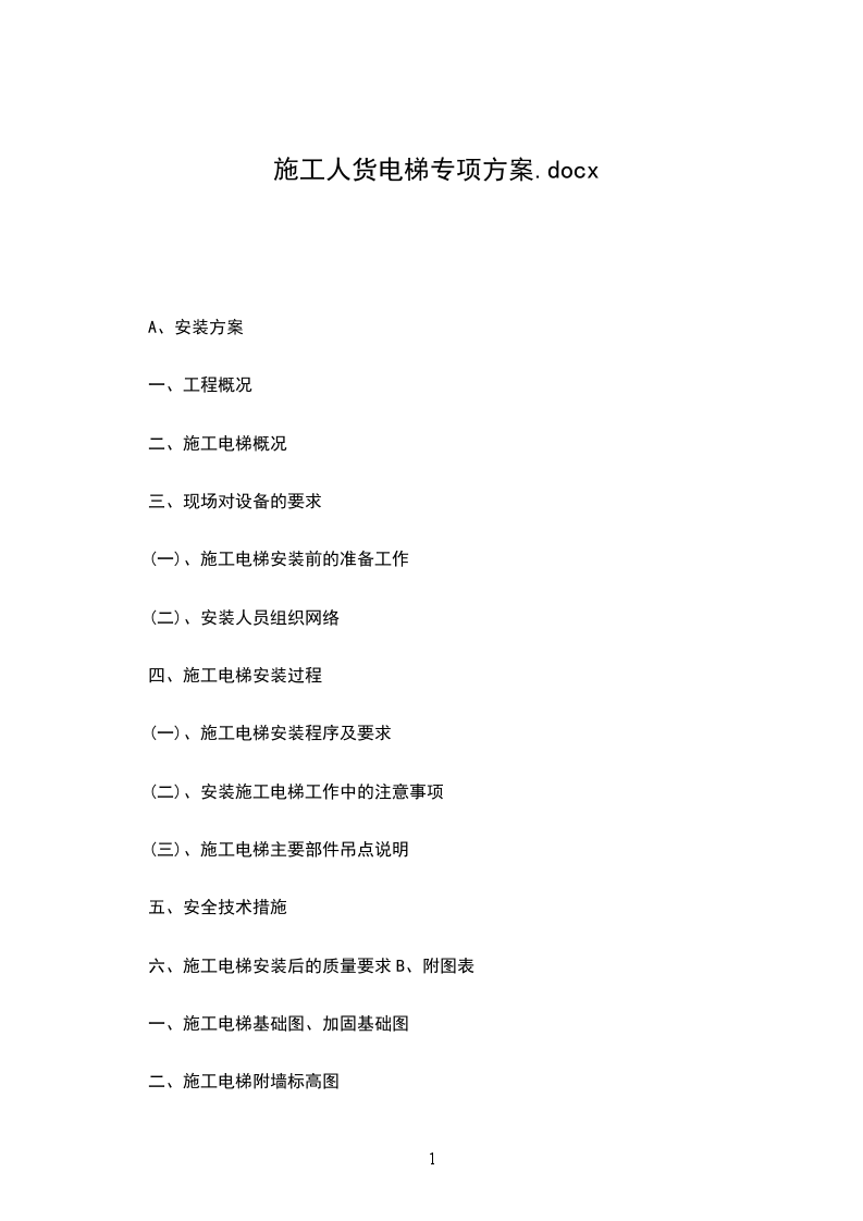 (二)、安装人员组织网络安装人员组织网络:施工电梯安装施工负责人:施工电梯安装技术负责人:施工电梯安装安全负责人:施工电梯安装班长:参加施工电梯安装人员:(三)、施工电梯对附墙部位的要求施工电梯相对建筑物位置见电梯安装位置图,附墙架形式采用型附墙,标准附墙间距为
