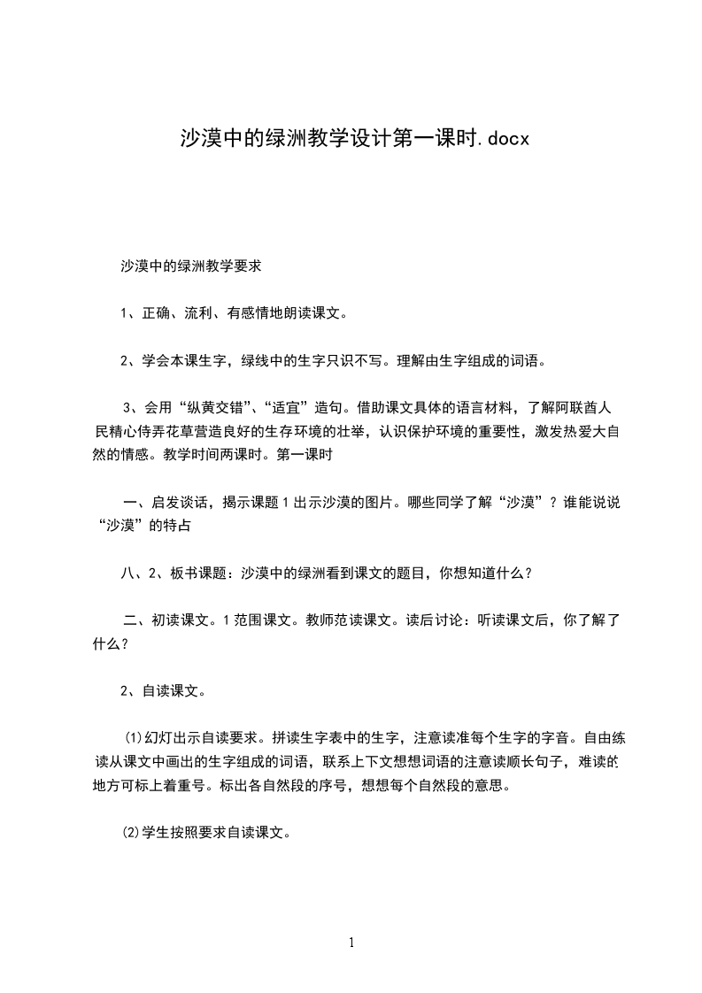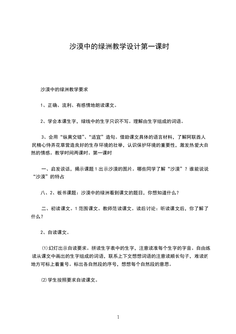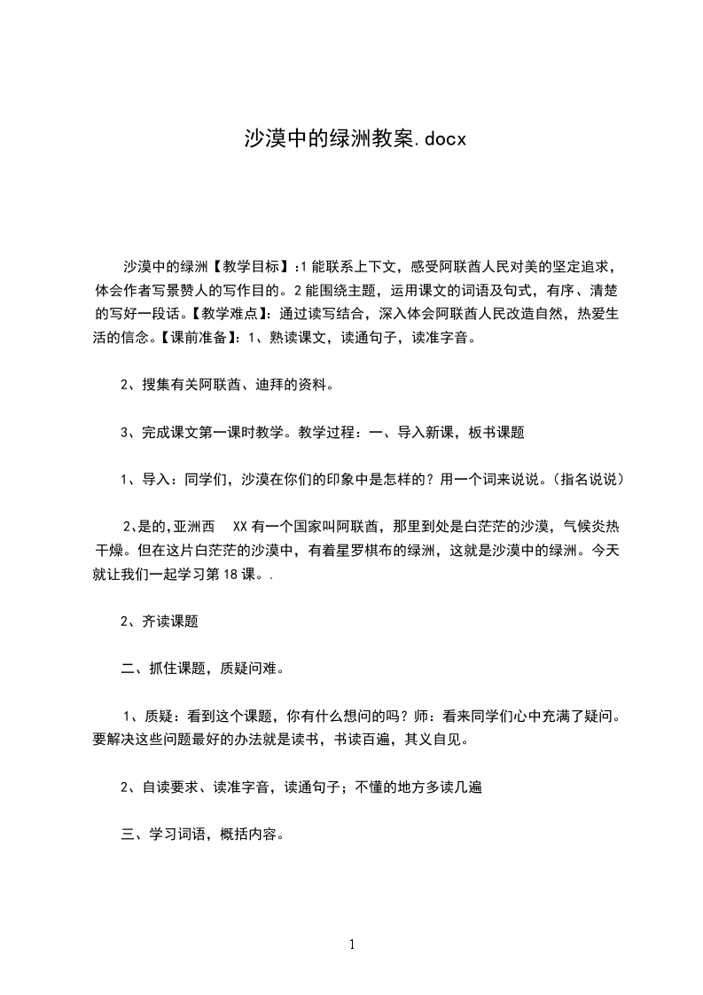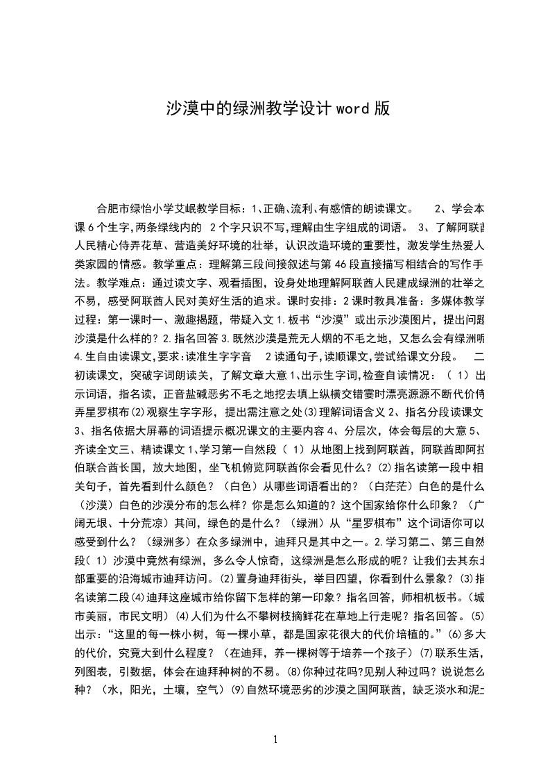 沙漠中的绿洲【教学目标】:1能联系上下文,感受阿联酋人民对美的坚定追求,体会作者写景赞人的写作目的。2能围绕主题,运用课文的词语及句式,有序、清楚的写好一段话。【教学难点】:通过读写结合,深入体会阿联酋人民改造自然,热爱生活的信念。【课前准备】:1、熟读课文,读通句子,读准字音。