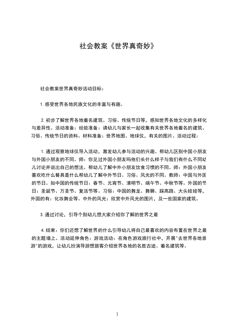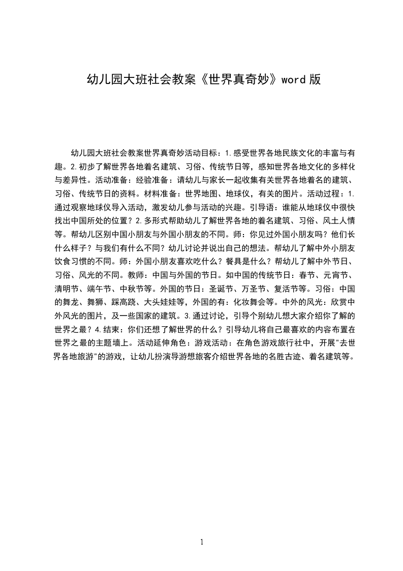 4.结束:你们还想了解世界的什么引导幼儿将自己最喜欢的内容布置在世界之最的主题墙上。活动延伸角色:游戏活动:在角色游戏旅行社中,开展"去世界各地旅游"的游戏,让幼儿扮演导游想旅客介绍世界各地的名胜古迹、着名建筑等。