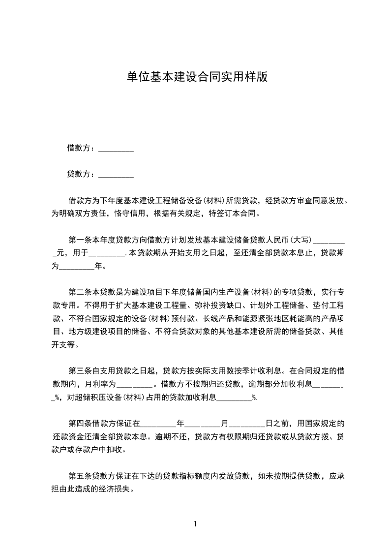 第一条本年度贷款方向借款方计划发放基本建设储备贷款人民币(大写)_________元,用于_________.本贷款期从开始支用之日起,至还清全部贷款本息止,贷款期为_________年。