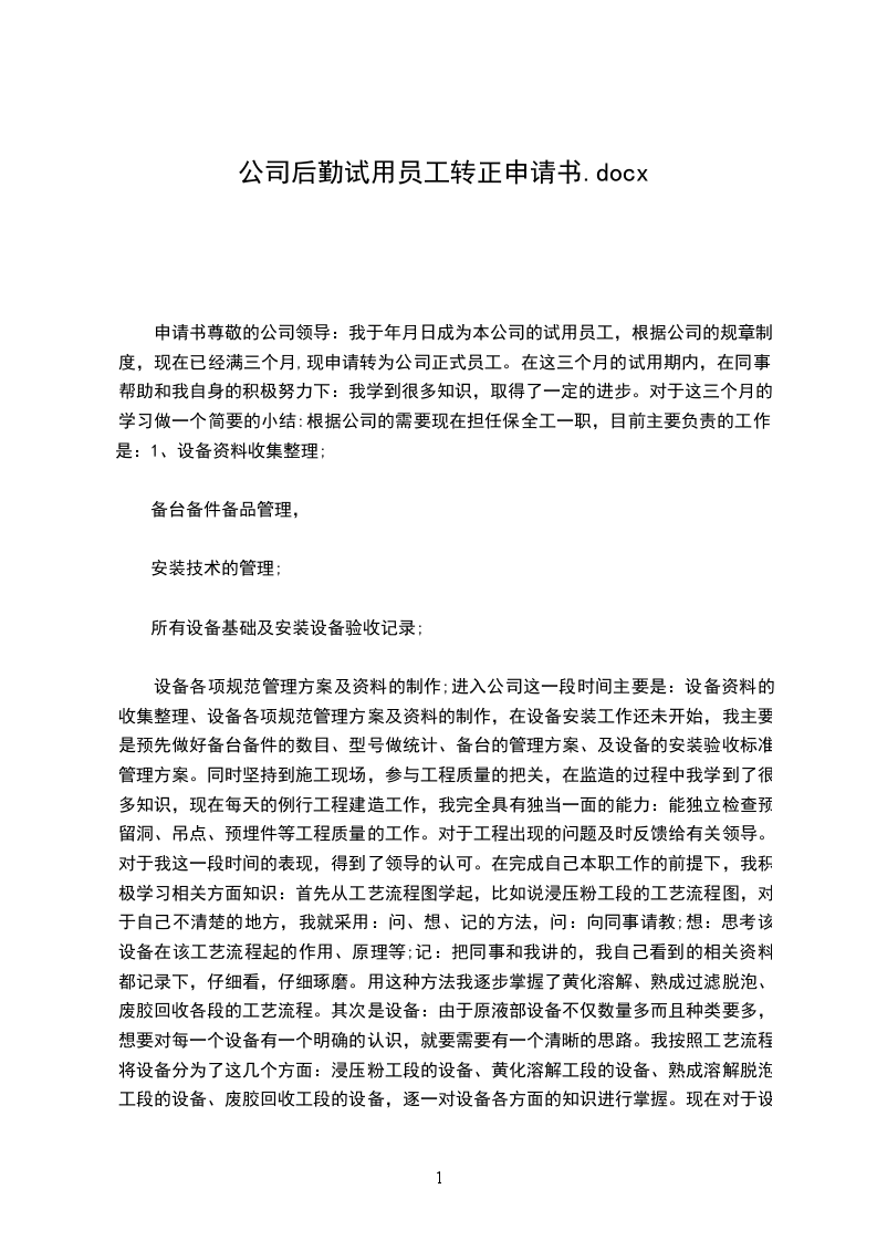 申请书尊敬的公司领导:我于年月日成为本公司的试用员工,根据公司的规章制度,现在已经满三个月,现申请转为公司正式员工。在这三个月的试用期内,在同事帮助和我自身的积极努力下:我学到很多知识,取得了一定的进步。对于这三个月的学习做一个简要的小结:根据公司的需要现在担任保全工一职,目前主要负责的工作是:1、设备资料收集整理;