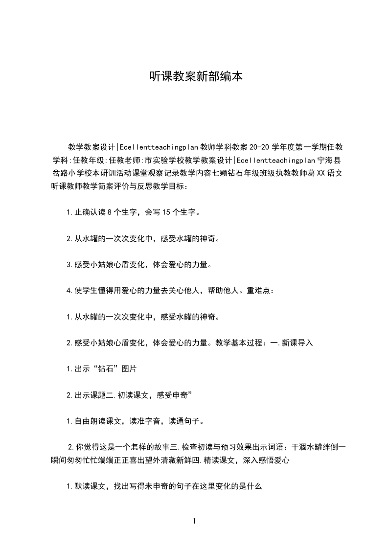 教学教案设计|Ecellentteachingplan教师学科教案20-20学年度第一学期任教学科:任教年级:任教老师:市实验学校教学教案设计|Ecellentteachingplan宁海县岔路小学校本研训活动课堂观察记录教学内容七颗钻石年级班级执教教师葛XX语文听课教师教学简案评价与反思教学目标: