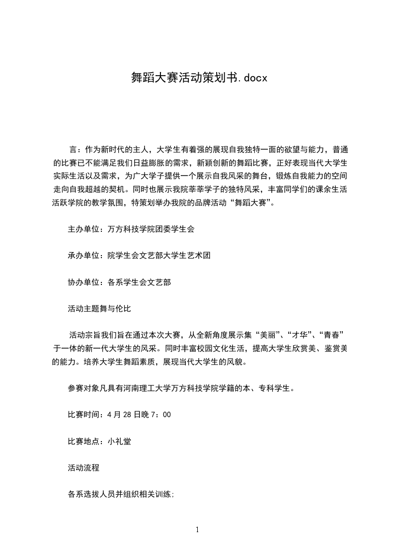 言:作为新时代的主人,大学生有着强的展现自我独特一面的欲望与能力,普通的比赛已不能满足我们日益膨胀的需求,新颖创新的舞蹈比赛,正好表现当代大学生实际生活以及需求,为广大学子提供一个展示自我风采的舞台,锻炼自我能力的空间,走向自我超越的契机。同时也展示我院莘莘学子的独特风采,丰富同学们的课余生活,活跃学院的教学氛围,特策划举办我院的品牌活动“舞蹈大赛”。