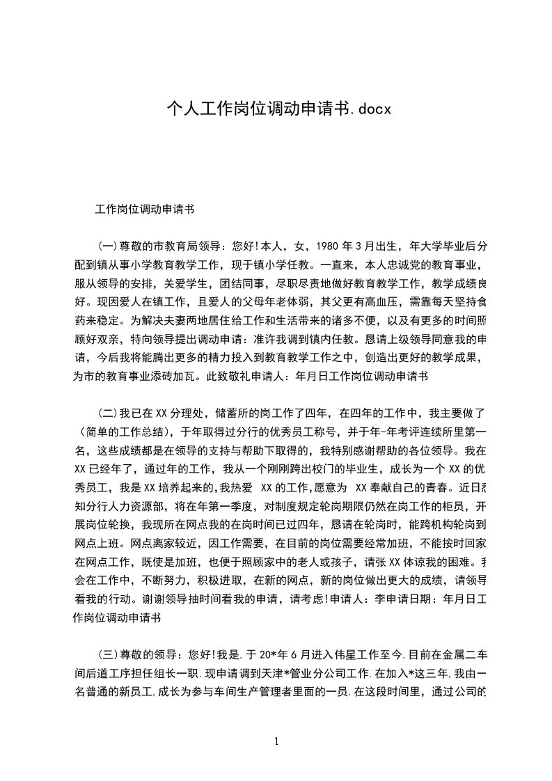 (一)尊敬的市教育局领导:您好!本人,女,1980年3月出生,年大学毕业后分配到镇从事小学教育教学工作,现于镇小学任教。一直来,本人忠诚党的教育事业,服从领导的安排,关爱学生,团结同事,尽职尽责地做好教育教学工作,教学成绩良好。现因爱人在镇工作,且爱人的父母年老体弱,其父更有高血压,需靠每天坚持食药来稳定。为解决夫妻两地居住给工作和生活带来的诸多不便,以及有更多的时间照顾好双亲,特向领导提出调动申请:准许我调到镇内任教。恳请上级领导同意我的申请,今后我将能腾出更多的精力投入到教育教学工作之中,创造出更好的教学成果,为市的教育事业添砖加瓦。此致敬礼申请人:年月日工作岗位调动申请书