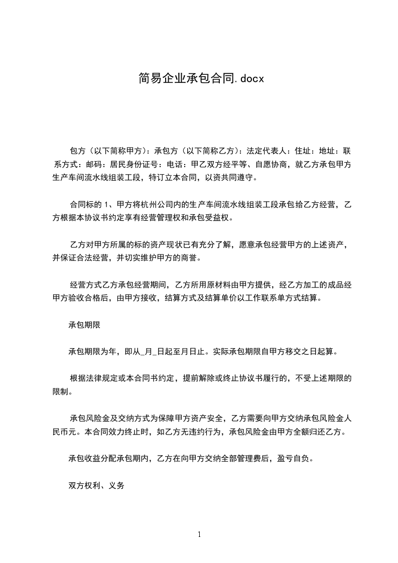 包方(以下简称甲方):承包方(以下简称乙方):法定代表人:住址:地址:联系方式:邮码:居民身份证号:电话:甲乙双方经平等、自愿协商,就乙方承包甲方生产车间流水线组装工段,特订立本合同,以资共同遵守。