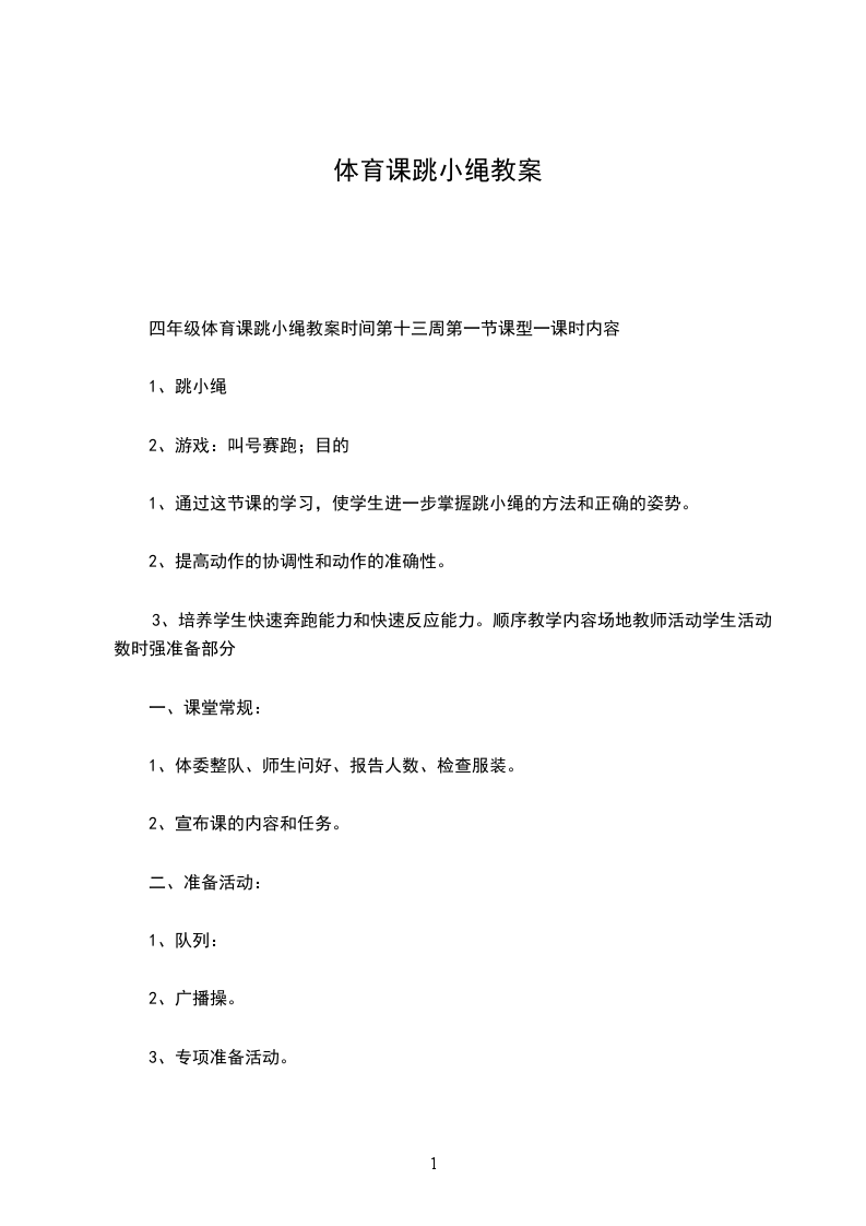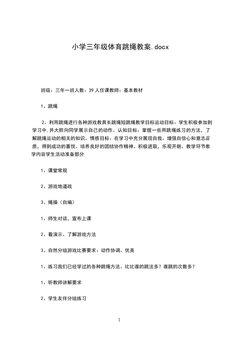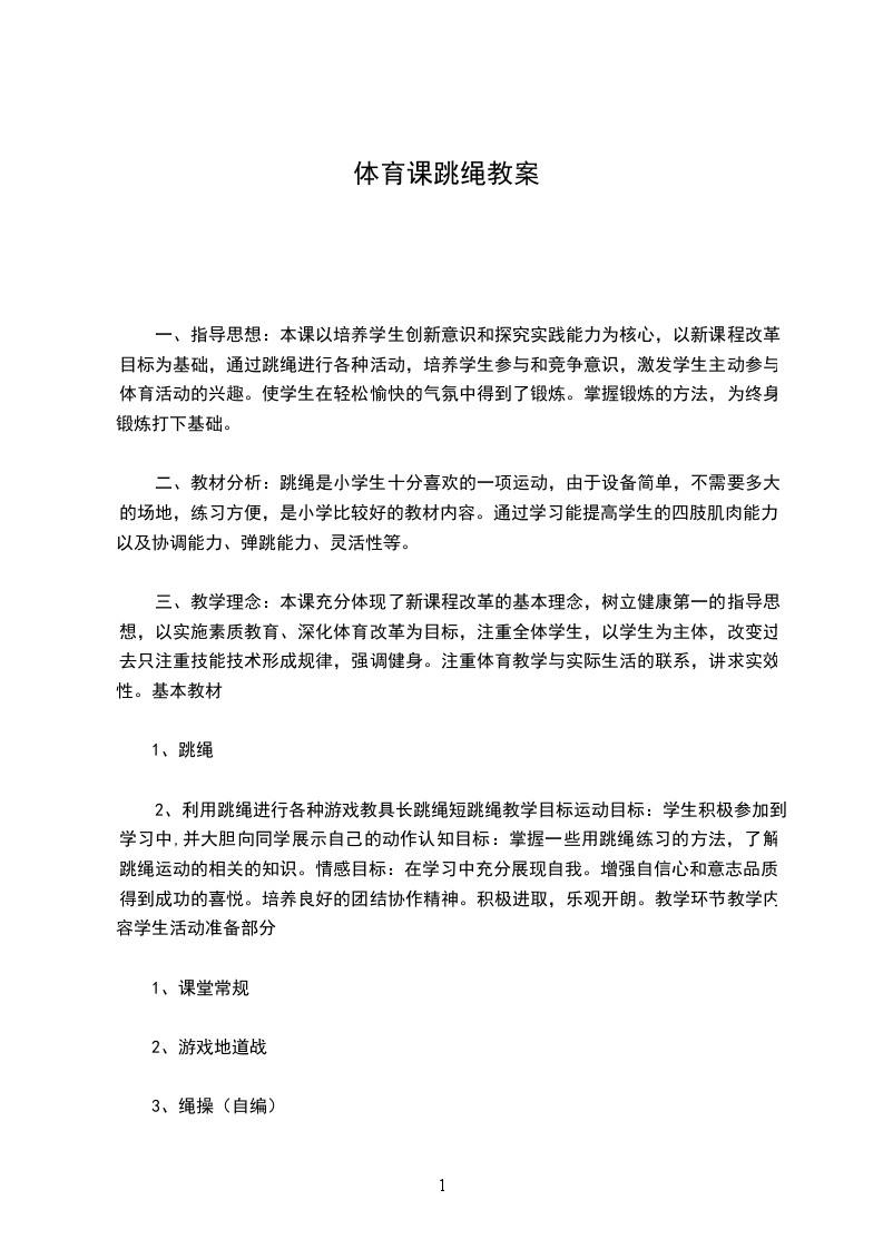 (三)、教材的选择跳绳是小学生十分喜欢的一种体冇活动。它是一种以下肢运动为主,结合上肢协调配合的一种身体活动,它可以通过控制动作的繁简和速度的快慢而很容易地达到调节运动量的目的,适合不同的年龄和性别。由于设备简单,不需要很大的场地容易开展,是小学体育教材中较好的内容。通过跳绳活动能够促进学生上下肢肌肉、关肖、韧带和内脏机能的发展,对于发展弹跳力、灵敏、协调性等具有显著作用。同时还可促进少儿智力、身高的增长,增强少儿心肺功能和胃肠功能。