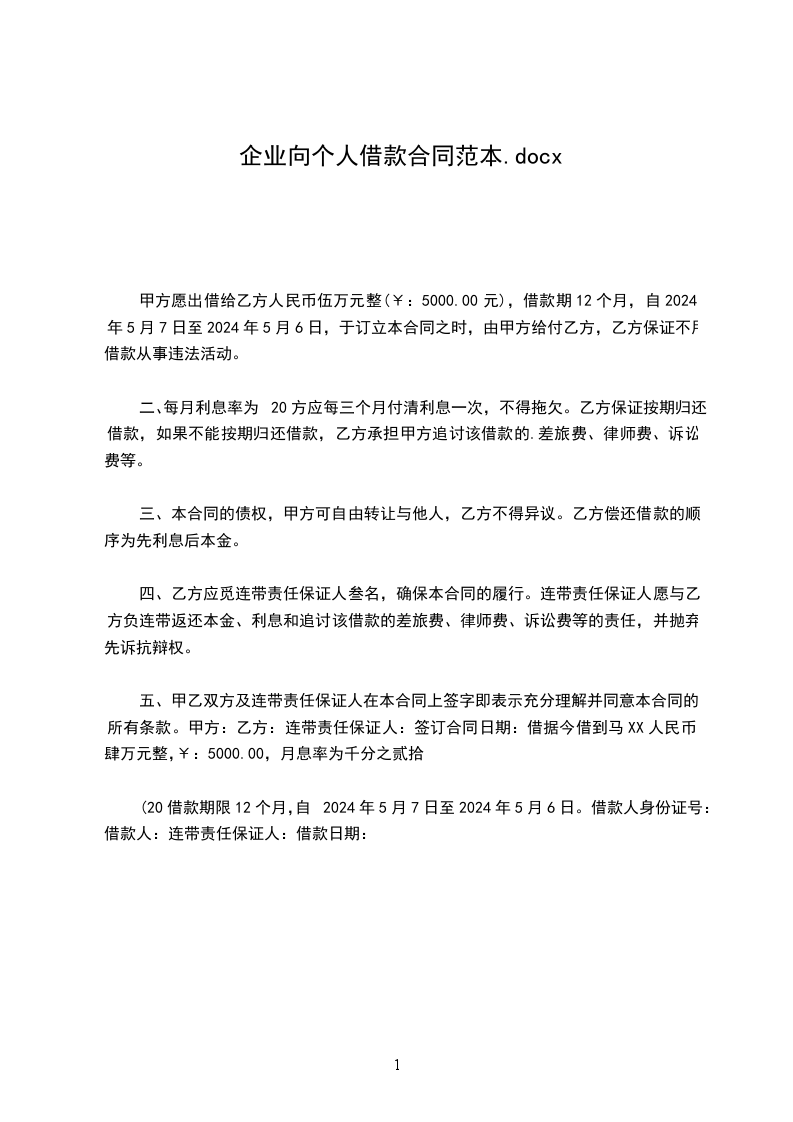 (20借款期限12个月,自2024年5月7日至2024年5月6日。借款人身份证号:借款人:连带责任保证人:借款日期: