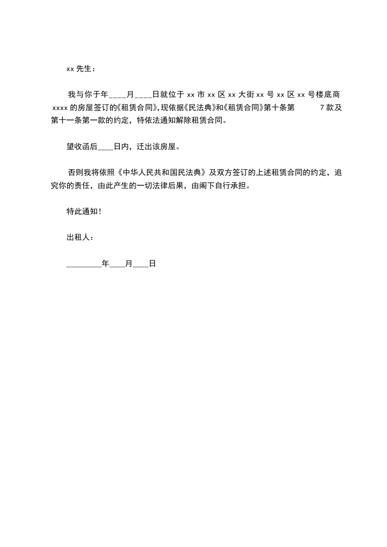 我与你于年____月____日就位于xx市xx区xx大街xx号xx区xx号楼底商xxxx的房屋签订的《租赁合同》,现依据《民法典》和《租赁合同》第十条第7款及第十一条第一款的约定,特依法通知解除租赁合同。