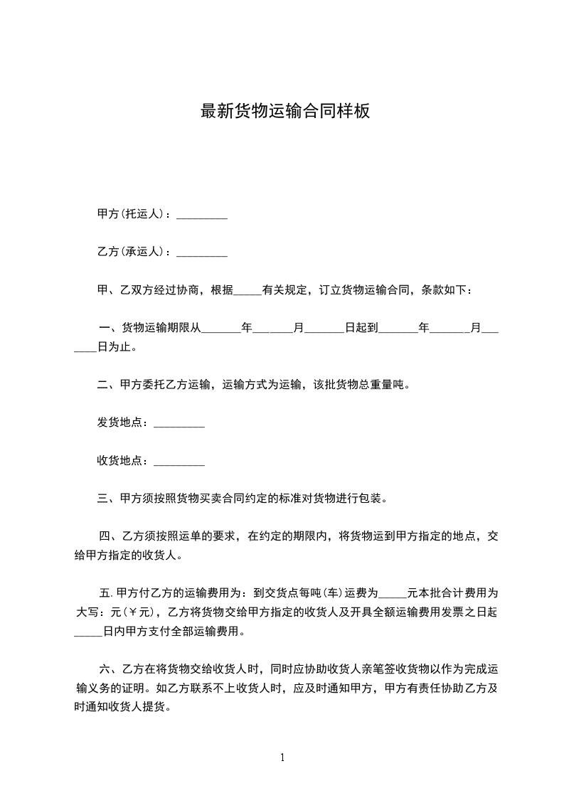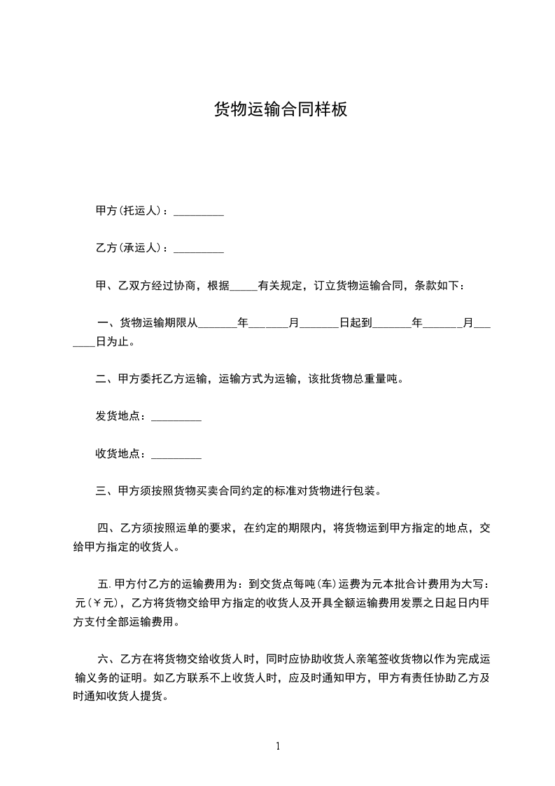 五.甲方付乙方的运输费用为:到交货点每吨(车)运费为_____元本批合计费用为大写:元(¥元),乙方将货物交给甲方指定的收货人及开具全额运输费用发票之日起_____日内甲方支付全部运输费用。