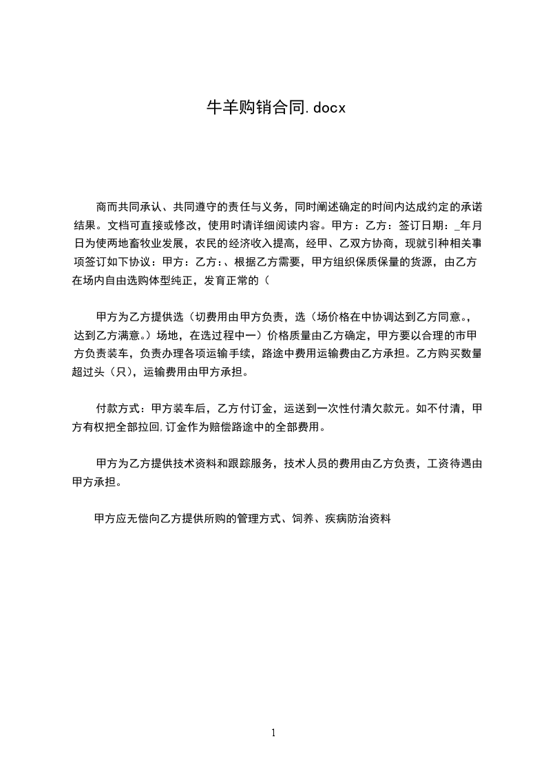 商而共同承认、共同遵守的责任与义务,同时阐述确定的时间内达成约定的承诺结果。文档可直接或修改,使用时请详细阅读内容。甲方:乙方:签订日期:_年月日为使两地畜牧业发展,农民的经济收入提高,经甲、乙双方协商,现就引种相关事项签订如下协议:甲方:乙方:、根据乙方需要,甲方组织保质保量的货源,由乙方在场内自由选购体型纯正,发育正常的(