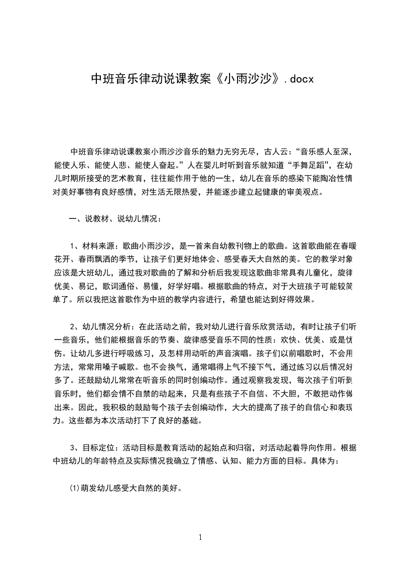 中班音乐律动说课教案小雨沙沙音乐的魅力无穷无尽,古人云:“音乐感人至深,能使人乐、能使人悲、能使人奋起。”人在婴儿时听到音乐就知道“手舞足蹈”,在幼儿时期所接受的艺术教育,往往能作用于他的一生,幼儿在音乐的感染下能陶冶性情,对美好事物有良好感情,对生活无限热爱,并能逐步建立起健康的审美观点。