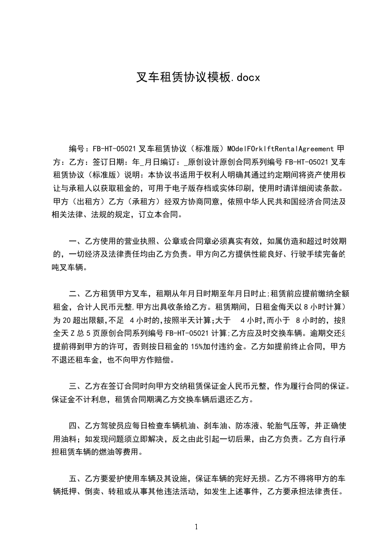 编号:FB-HT-O5021叉车租赁协议(标准版)MOdelFOrklftRentalAgreement甲方:乙方:签订日期:年_月日编订:_原创设计原创合同系列编号FB-HT-O5021叉车租赁协议(标准版)说明:本协议书适用于权利人明确其通过约定期间将资产使用权让与承租人以获取租金的,可用于电子版存档或实体印刷,使用时请详细阅读条款。甲方(出租方)乙方(承租方)经双方协商同意,依照中华人民共和国经济合同法及相关法律、法规的规定,订立本合同。