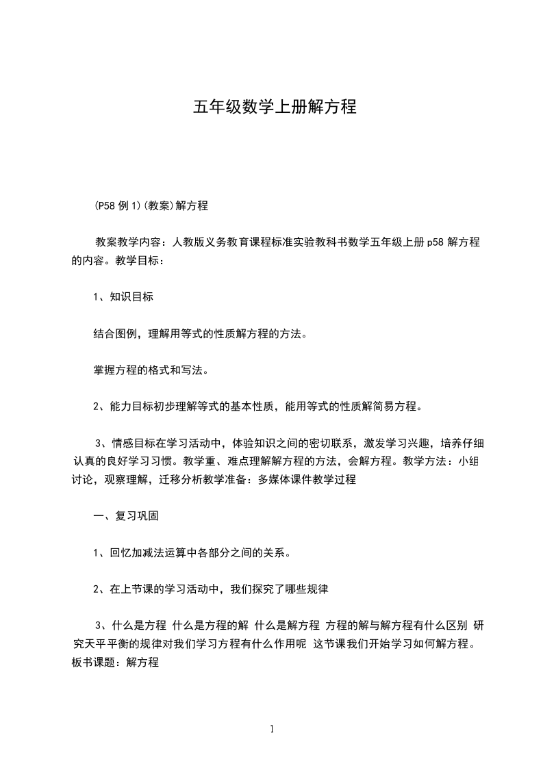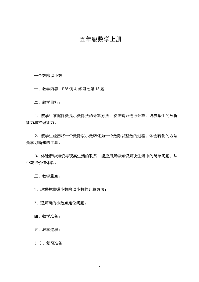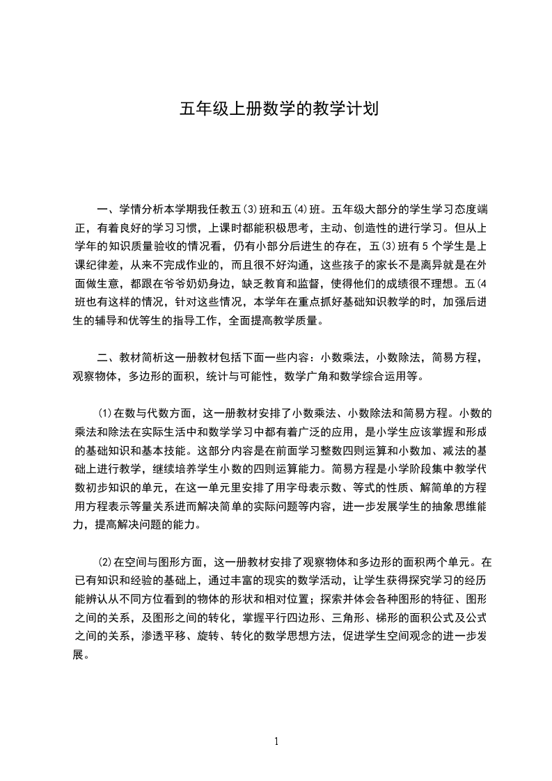 二、教材分析本册教材内容包括:小数乘法和小数除法;对称、平移和旋转;简易方程;因数与倍数;多边形的面积;统计。小数乘法和除法在实际生活中和数学学习都有着广泛的应用,这部分内容是在前面学习整数四则运算和小数加、减法的基础上进行教学,继续培养学生小数的四则运算能力.简易方程是小学阶段集中教学代数初步知识的单元,在这一单元里安排了用字母表示数、等式的性质、解简单的方程、用方程表示等量关系进而解决简单的实际问题等内容,进一步发展学生的抽象思维能力,提高解决问题的能力。观察物体和多边形的面积两个单元在已有知识和经验的基础上,通过丰富的现实的数学活动,让学生获得探究学习的经历,能辨认从不同方位看到的物体的形状和相对位置;探索并体会各种图形的特征、图形之间的关系,及图形之间的转化,掌握平行四边形、三角形、梯形的面积公式及公式之间的关系,渗透平移、旋转、转化的数学思想方法,促进学生空间观念的进一步发展.在用数学解决问题方面,教材一方面结合小数乘法和除法两个单元,教学用所学乘除法计算知识解决生活中的简单问题。教学目标:使学生在理解小数的意义和性质的基础上,比较熟练地进行小数乘法和除法的笔算和简单的口算。