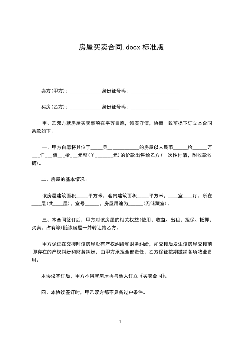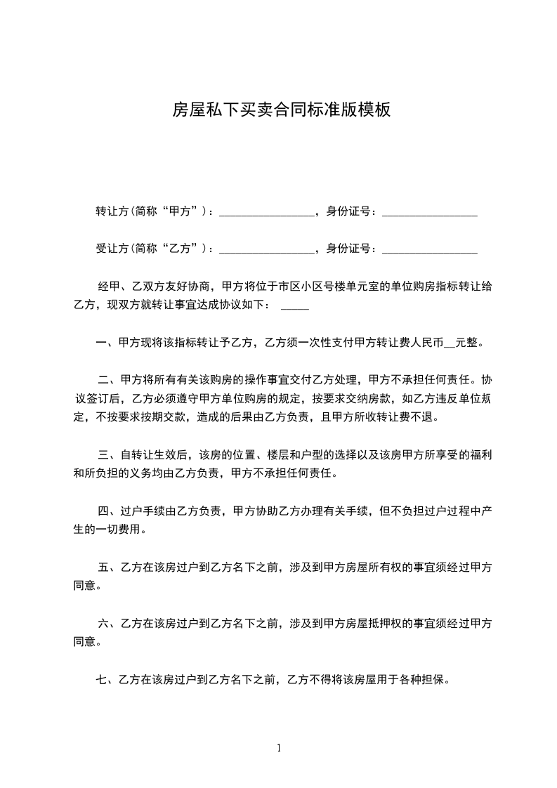 二、附加条款:1、转让过后,甲方不的以任何借口干涉乙方对房屋的修改。甲方(卖方):(印)身份证号:住址:电话:年_月_日乙方(买方):(印)身份证号:住址:电话