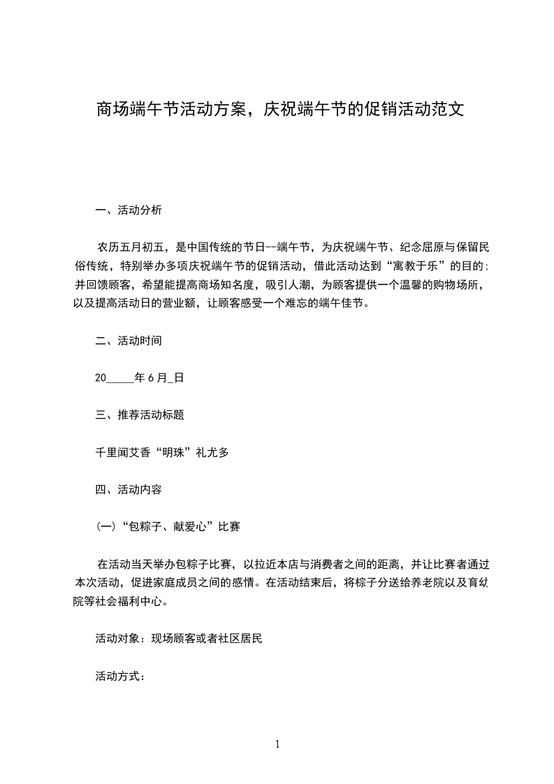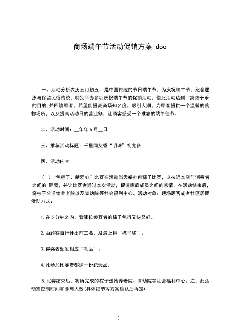 (一)“包粽子、献爱心”比赛在活动当天举办包粽子比赛,以拉近本店与消费者之间的距离,并让比赛者通过本次活动,促进家庭成员之间的感情。在活动结束后,将棕子分送给养老院以及育幼院等社会福利中心。活动对象:现场顾客或者社区居民活动方式: