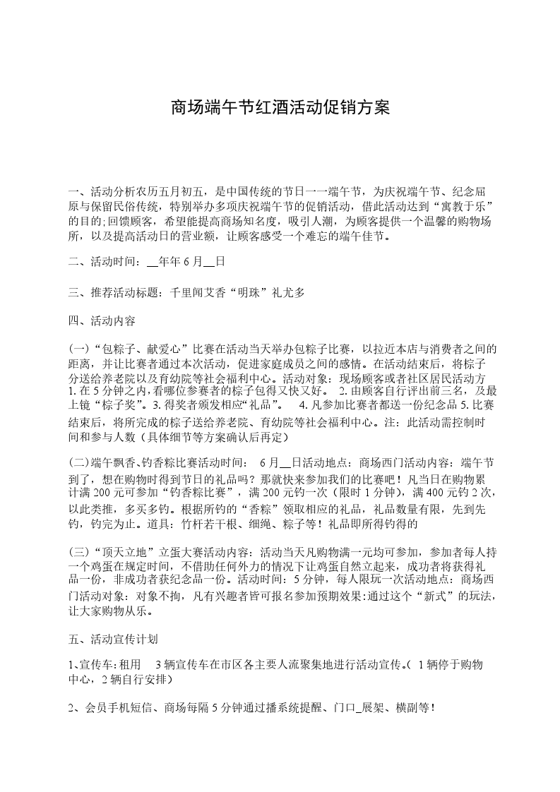 (二)端午飘香、钓香粽比赛活动时间:6月10日活动地点:商场西门活动内容:端午节到了,想在购物时得到节日的礼品吗?那就快来参加我们的比赛吧!凡当日在购物累计满20可参加“钓香粽比赛”,满20钓一次(限时1分钟),满400元钓2次,以此类推,多买多钓。根据所钓的“香粽”领取相应的礼品,礼品数量有限,先到先钓,钓完为止。道具:竹杆若干根、细绳、粽子等!礼品即所得钓得的“粽子”。