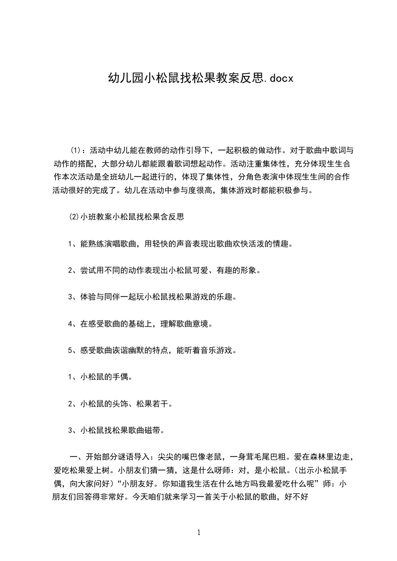 (1)教师向幼儿介绍游戏玩法。玩法:请10位小朋友戴上头饰扮演小松鼠,其余幼儿扮演大松树。扮演松树的小朋友到场地内围成一个大圆圈,双手背在身后。教师把松果一部分分给扮演松树的小朋友。所有扮演松树的小朋友都要背好手,不要让小松鼠知道哪些“松树”有松果。扮演小松鼠的幼儿到圆圈中间蹲下。活动反思:活动中幼儿能在教师的动作引导下,一起积极的做动作。对于歌曲中歌词与动作的搭配,大部分幼儿都能跟着歌词想起动作。活动注重集体性,充分体现生生合作本次活动是全班幼儿一起进行的,体现了集体性,分角色表演中体现生生间的合作。活动很好的完成了。幼儿在活动中参与度很高,集体游戏时都能积极参与。