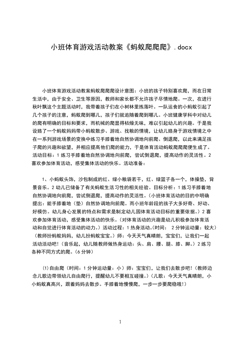 小班体育游戏活动教案蚂蚁爬爬爬设计意图:小班的孩子特别喜欢爬,而在日常生活中,由于安全、卫生等原因,教师和家长都不允许孩子尽情地爬。一次,在进行秋叶飘这个主题活动时,我带着孩子们在小树林里拣落叶。一队运食的小蚂蚁引起了几个孩子的注意,蚂蚁爬到哪儿,孩子们就追随着爬到哪儿。小班健康学科中对幼儿的爬有明确的目标和要求,而机械的爬显得枯燥无味,难以引起幼儿的兴趣。于是我设臵了一个蚂蚁妈妈带小蚂蚁散步、游戏、找粮的情境,让幼儿臵身于游戏情境之中,在一系列游戏场景的变换中练习手膝着地自然协调地向前爬、倒退爬,以此来满足孩子爬的兴趣和欲望,并相应提高他们爬的能力,于是体育活动蚂蚁爬爬爬便生成了。活动目标:1练习手膝着地自然协调地向前爬,尝试倒退爬,提高动作的灵活性。2喜欢参加体育活动,感受集体活动的快乐。活动准备: