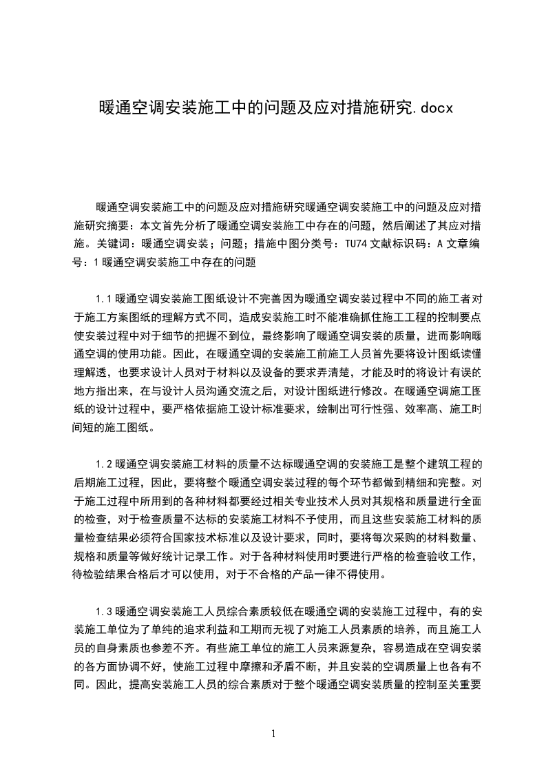 暖通空调安装施工中的问题及应对措施研究暖通空调安装施工中的问题及应对措施研究摘要:本文首先分析了暖通空调安装施工中存在的问题,然后阐述了其应对措施。关键词:暖通空调安装;问题;措施中图分类号:TU74文献标识码:A文章编号:1暖通空调安装施工中存在的问题