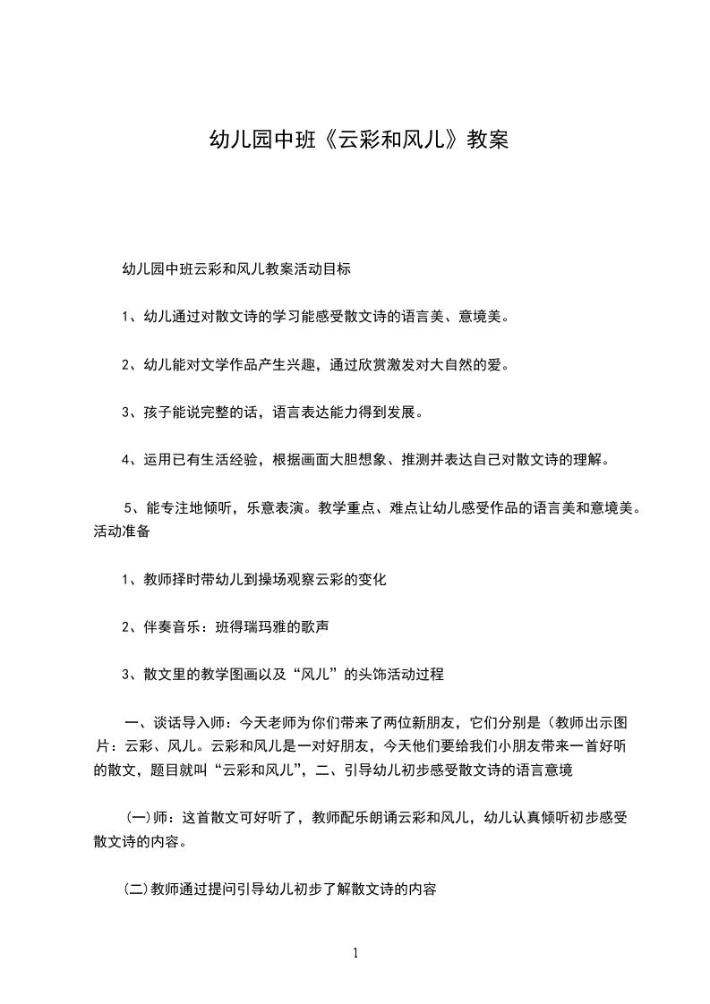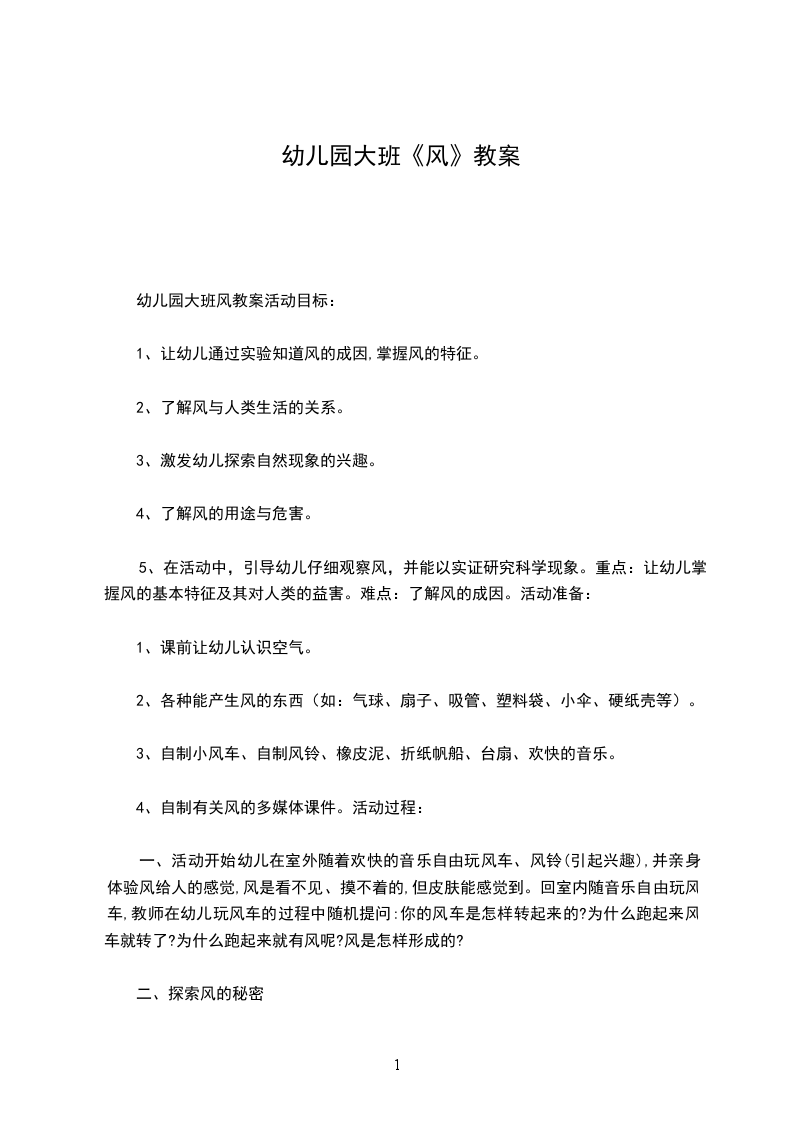 2、难点:知道风的形成及特性。活动准备风铃、纸风车、气球、羽毛、扇子、硬纸板、打气筒、玩具吹风机等。活动过程在第一环节中,我以猜谜语的方式引起幼儿的注意,激发幼儿的兴趣。(看不见我的影子,捉不住我的身子。沙沙沙,有时我只摇树枝。呼呼呼,有时我要推倒房屋。)请你猜猜我是谁引导幼儿根据经验猜出谜底风。第二个环节是探索风的成因,了解风的特性。在这个环节中,我会引导幼儿用“吹气球”、“放气”、“小手扇风”、“扇快扇慢有何不同”等一系列活动,让幼儿知道空气的流动形成风。又通过“用手抓风”的活动让幼儿真正认识到风只能感觉到,是看不见,抓不着的。活动中,幼儿通过自己的所见所闻和亲身感受来证明风的存在,用实验来探索风的成因。尽管探索的结果与真正科学意义上的风的成因还有一定的距离,但是这样的探究,可以培养幼儿注重以事实为依据进行推理和得出结论的精神。第三个环节是大胆尝试,想办法制造风。此环节,首先我引导小朋友玩一个利用自己的身体部位制造风的游戏。“小朋友们!看!我们的活动室挂了很多风铃,试一试,谁能用自己身体的各部位,想办法产生风,仍风铃响起来呢”根据已有经验,小朋友很快就会用小嘴吹一吹,用小手扇一扇,让风铃响起来了。由于是小朋友亲自所为,听到了叮叮当当的声音,他们的脸上都洋溢着成功的喜悦。接下来,我会说:“小朋友!老师今天还为你们准备了好多好玩的东西,有纸风车、扇子、硬纸板、打气筒、玩具吹风机等。大家想一想!如果不碰到风车,怎么让风车转起来呢如果你能,你是用的哪种材料,用的什么方法让风车转起来的赶快试试吧。”由于我为幼儿提供了丰富的可操作的材料,给每个幼儿都能参加活动提供了条件,那么幼儿会借助已有的生活经验和各种辅助材料,运用多种感官,多种方式进行探索,想出各种办法来制造风。这样既提高了幼儿的自主探究、动手动脑的能力,还培养了幼儿的合作精神,在不断地尝试与探索中突出了活动目标中的重点。教学反思本节活动结束后,我会组织幼儿互相交流。幼儿用自己的操作经验向大家表达自己的想法、做法和自己在操作中的发现,通过交流,幼儿不仅向别人介绍了自己的制作风的方法,还能从别人那里得到启发;这样,不仅发展了幼儿语言表达能力,还拓宽了幼儿的思维空间。最后教幼儿一首儿歌我会制造风,这样不仅突出了活动的主题,还巩固了幼儿所学的知识,加深了幼儿对制造风的印象。我会制造风我的小嘴吹一吹,我用扇子挥一挥我拿纸张甩一甩呼呼呼,真凉快。吹风机呀你快来,快把羽毛吹起来,打气筒呀你别跑,来把气球给喂饱,呼呼呼沙沙沙哪里都能遇到它。4