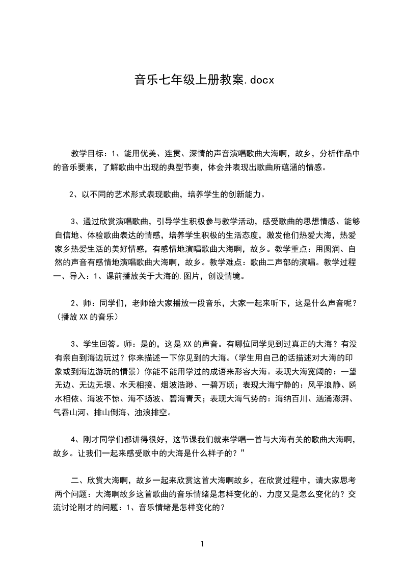 教学目标:1、能用优美、连贯、深情的声音演唱歌曲大海啊,故乡,分析作品中的音乐要素,了解歌曲中出现的典型节奏,体会并表现出歌曲所蕴涵的情感。