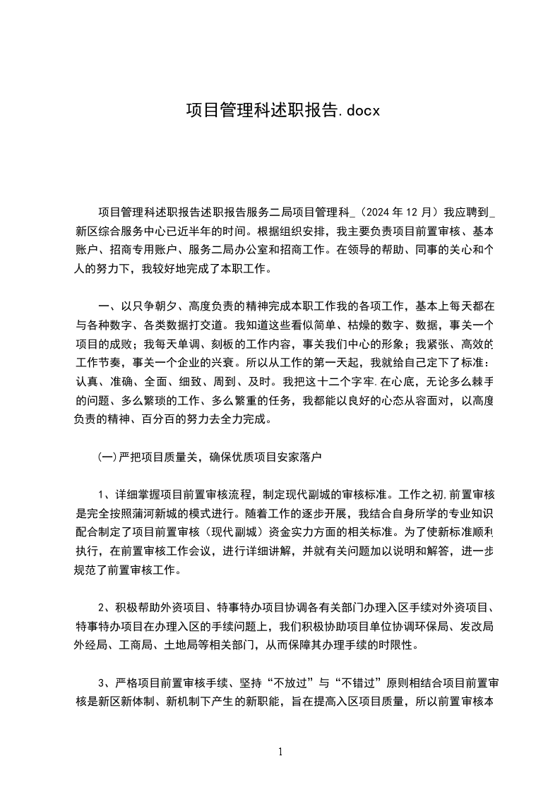 项目管理科述职报告述职报告服务二局项目管理科_(2024年12月)我应聘到_新区综合服务中心已近半年的时间。根据组织安排,我主要负责项目前置审核、基本账户、招商专用账户、服务二局办公室和招商工作。在领导的帮助、同事的关心和个人的努力下,我较好地完成了本职工作。
