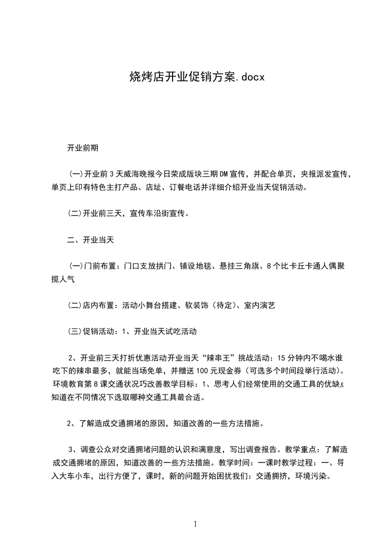 2、开业前三天打折优惠活动开业当天“辣串王”挑战活动:15分钟内不喝水谁吃下的辣串最多,就能当场免单,并赠送100元现金券(可选多个时间段举行活动)。环境教育第8课交通状况巧改善教学目标:1、思考人们经常使用的交通工具的优缺点,知道在不同情况下选取哪种交通工具最合适。