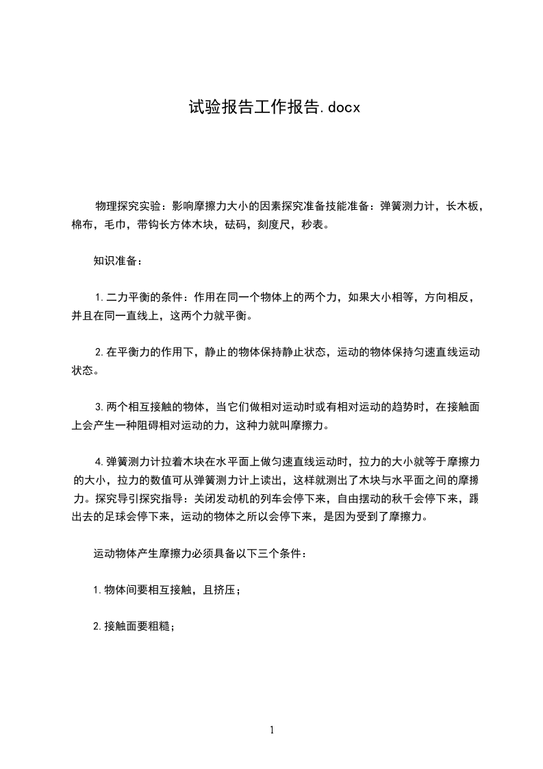 提出问题:摩擦力大小与什么因素有关?猜想1:摩擦力的大小可能与接触面所受的压力有关。猜想2:摩擦力的大小可能与接触面的粗糙程度有关。猜想3:摩擦力的大小可能与产生摩擦力的两种物体间接触面积的大小有关。探究方案:用弹簧测力计匀速拉动木块,使它沿长木板滑动,从而测出木块与长木板之间的摩擦力;改变放在木块上的砝码,从而改变木块与长木板之间的压力;把棉布铺在长木板上,从而改变接触面的粗糙程度;改变木块与长木板的接触面,从而改变接触面积。物理实验报告化学实验报告生物实验报告实验报告格式实验报告模板探究过程: