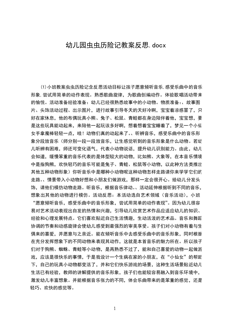 (1)小班教案虫虫历险记含反思活动目标让孩子愿意倾听音乐,感受乐曲中的音乐形象,尝试用简单的动作表现。熟悉歌曲旋律,为歌曲创编动作。体验歌唱活动带来的愉悦。活动准备经验准备:幼儿已经很熟悉故事中的小动物。物质准备:、故事图片、头饰活动过程、出示图片,进行故事引导冬天的天好冷啊,宝宝着凉感冒了,只好在家休息,他的布偶玩具小熊、兔子、松鼠、青蛙都在身边陪伴着他,宝宝想,要是这些玩具能动起来,来陪他一起玩该多好啊,想着想着宝宝睡着了,梦见一个小仙女手拿魔棒轻轻一点,哇!动物们真的动起来了。、听辨音乐,感受乐曲中的音乐形象分段放音乐(师分别一段一段放音乐,让生感觉听到的音乐形象是什么动物。若幼儿听辨有困难,师还可变化语气,代表小动物说话,提升幼儿识别能力。由此,幼儿会知道,缓慢笨重的音乐代表的是体型较大的动物,比如熊、大象等,在本音乐情境中是指狗熊,欢快轻巧的音乐可能是兔子、青蛙、松鼠等小动物,以此种方法类推出其他五种动物形象)你听音乐中是哪种小动物呢这种动物怎样走路请你来学学它们的走路。、情景带入小动物好想和小朋友们做游戏,那样一定会很开心。给幼儿分发头饰,请他们模仿动物走路。听音乐,根据音乐律动。、活动延伸根据听到不同的音乐,想象出其他的动物进行模仿。活动反思:本活动选自艺术领域(音乐活动),小班“愿意倾听音乐,感受乐曲中的音乐形象,尝试用简单的动作表现”。因为幼儿很容易对艺术活动表现出自发的热情和兴趣,引导幼儿欣赏艺术作品应适应幼儿的知识、经验和心理发展特点。它们喜欢贴近自己生活情趣,生动活泼的艺术品。音乐和舞蹈协调的节奏和动感旋律会使幼儿感受到最强烈的审美享受。孩子们对小动物有着与生俱来的喜爱,并愿意与之亲近。能在倾听音乐中去感受乐曲中的音乐形象,同时根据在充分发挥想象下的不同动物来表现其动作,这就是本首音乐的魅力所在。所以孩子们对于狗熊、蜘蛛、青蛙等小动物,是再熟悉不过了,能和自己喜爱的动物一起做游戏,应该是很快乐的事情,于是我设计一个生病在家的小朋友,在“小仙女”的帮助下,自己的玩具小动物都变活了,并和它们快乐游戏的场景,这种生活场景贴近幼儿生活已有经验,教师的讲解提供的音乐形象,孩子们也能较容易融入到音乐环境中,激发幼儿丰富想象。并能根据音乐张力的不同,体会乐曲带来的是笨重的感觉,还是轻巧、欢快的感觉等。