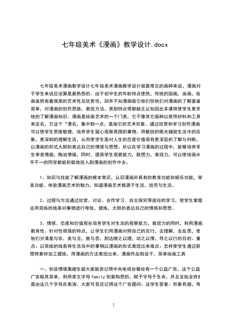 七年级美术漫画教学设计七年级美术漫画教学设计就最常见的画种来说,漫画对于学生来说应该算是最熟悉的。由于初中生的年龄特点使然,传统的国画,油画,版画虽然有着很高的艺术性及欣赏性,却并不如漫画吸引他们但他们对漫画的了解普遍简单,对漫画的创作思路,表现方法,类别特点等都缺乏认知因此本课将使学生更系统的了解漫画知识。漫画是绘画艺术的一个门类,它不像其它画种以使用材料和工具来定名,它这个“漫名,集中到一点,是指它的艺术形象。通过欣赏和学习创作漫画,可以使学生思维敏捷,培养学生留心观察周围的事物,用敏锐的眼光捕捉生活中的现象,更深刻的理解生活,从而使学生面对人生的态度价值观有更深层的了解与判断,以漫画的形式大胆的表达自己的情感与思想。所以在学习漫画的过程中,能够培养学生审美情趣,陶冶情操,同时,提高学生观察能力,联想力,表现力,可以使绘画水平不一的同学都能积极地投入到漫画的创作中去。