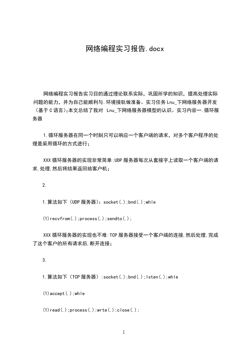 网络编程实习报告实习目的通过理论联系实际,巩固所学的知识,提高处理实际问题的能力,并为自己能顺利与.环境接轨做准备。实习任务Lnu_下网络服务器开发(基于C语言);本文总结了我对Lnu_下网络服务器模型的认识。实习内容一.循环服务器