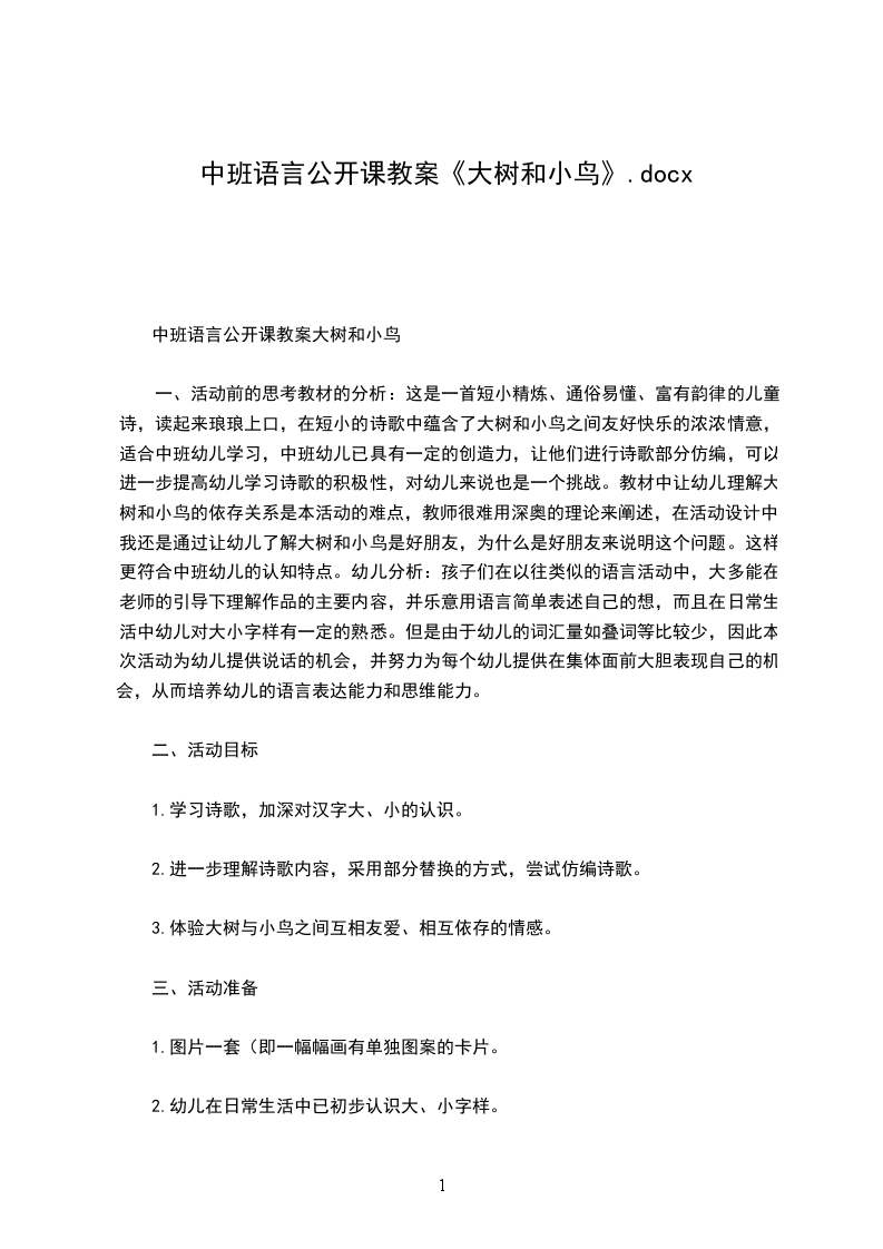 2.出示大小字样让幼儿猜测。教师:原来是一位大客人和一位小客人呀。3教师:其实呀它们各自有一个好听的名字呢一个叫大树,一个叫小鸟。它们给我们班的小朋友带来了一首好听的诗歌,名字叫大树和小鸟。