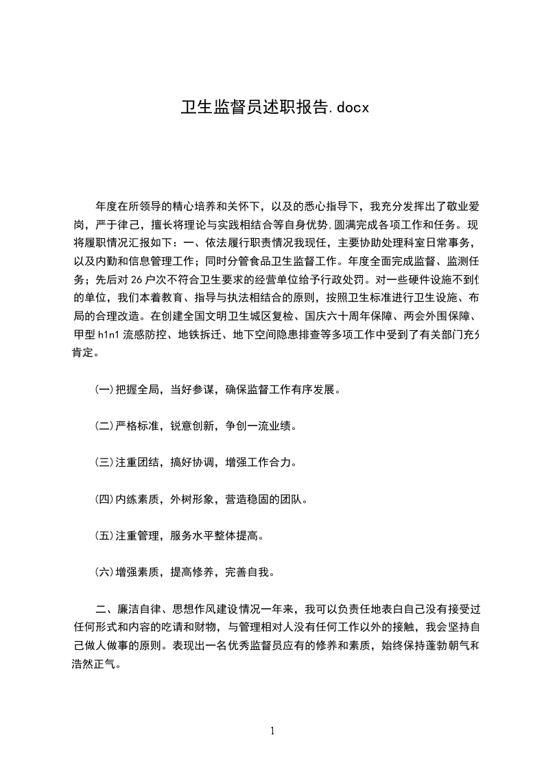 年度在所领导的精心培养和关怀下,以及的悉心指导下,我充分发挥出了敬业爱岗,严于律己,擅长将理论与实践相结合等自身优势,圆满完成各项工作和任务。现将履职情况汇报如下:一、依法履行职责情况我现任,主要协助处理科室日常事务,以及内勤和信息管理工作;同时分管食品卫生监督工作。年度全面完成监督、监测任务;先后对26户次不符合卫生要求的经营单位给予行政处罚。对一些硬件设施不到位的单位,我们本着教育、指导与执法相结合的原则,按照卫生标准进行卫生设施、布局的合理改造。在创建全国文明卫生城区复检、国庆六十周年保障、两会外围保障、甲型h1n1流感防控、地铁拆迁、地下空间隐患排查等多项工作中受到了有关部门充分肯定。