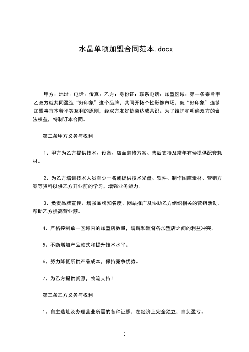 甲方:地址:电话:传真:乙方:身份证:联系电话:加盟区域:第一条宗旨甲乙双方就共同盈造“好印象”这个品牌,共同开拓个性影像市场,既“好印象”连锁加盟事宜本着平等互利的原则,经双方友好协商达成共识。为了维护和明确双方的合法权益,特制订本合同。