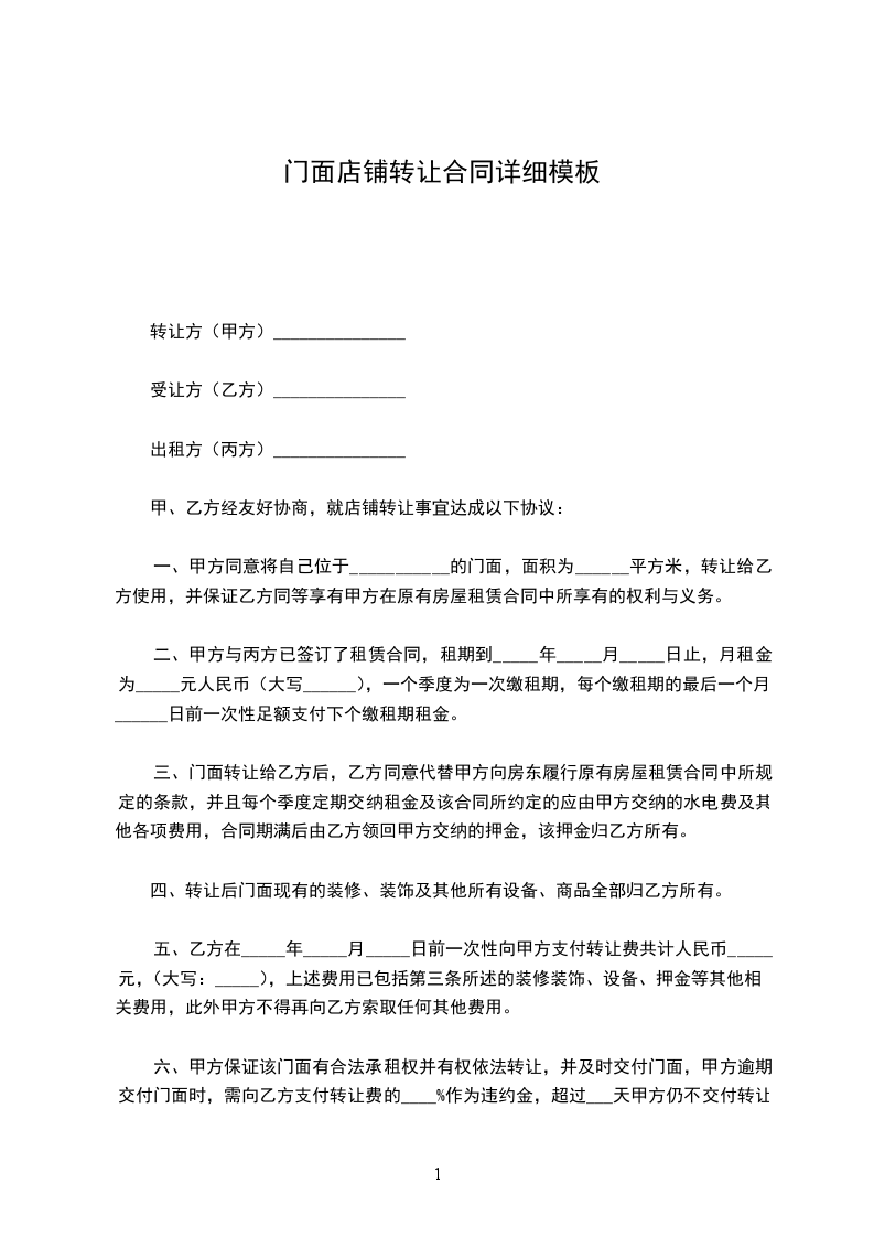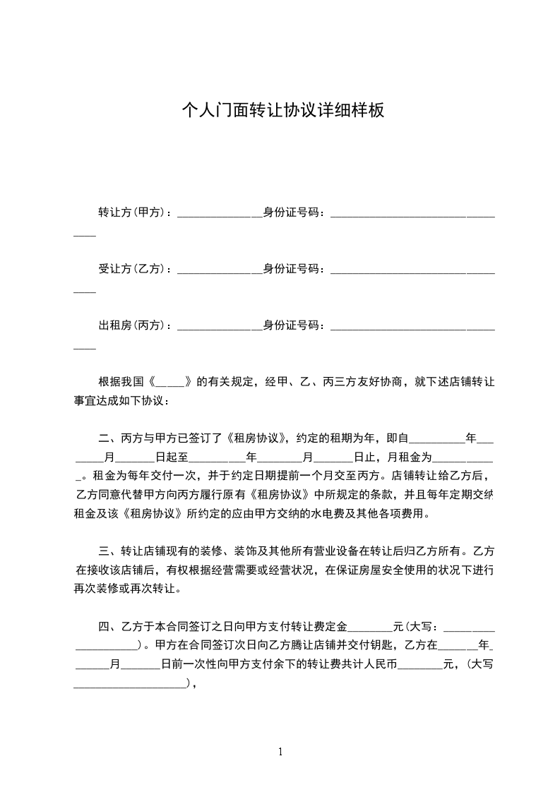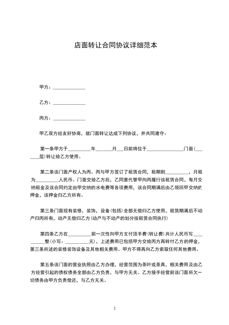 二、丙方与甲方已签订了《租房协议》,约定的租期为年,即自__________年________月_______日起至__________年________月_______日止,月租金为____________。租金为每年交付一次,并于约定日期提前一个月交至丙方。店铺转让给乙方后,乙方同意代替甲方向丙方履行原有《租房协议》中所规定的条款,并且每年定期交纳租金及该《租房协议》所约定的应由甲方交纳的水电费及其他各项费用。