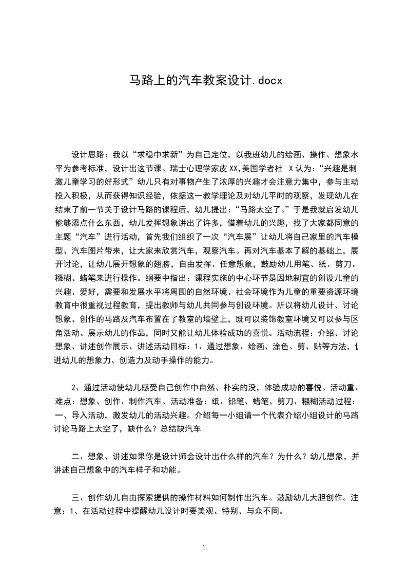 2.游戏12次。活动延伸:将活动中的车辆、交通标志照片放入区域中,供幼儿进一步观察,尝试绘画各种各样的汽车,进一步对汽车的外形进行感知,同时收集和了解马路上标志的作用。3设计思路:我以“求稳中求新”为自己定位,以我班幼儿的绘画、操作、想象水平为参考标准,设计出这节课。瑞士心理学家皮XX,美国学者杜X认为:“兴趣是刺激儿童学习的好形式”幼儿只有对事物产生了浓厚的兴趣才会注意力集中,参与主动,投入积极,从而获得知识经验,依据这一教学理论及对幼儿平时的观察,发现幼儿在结束了前一节关于设计马路的课程后,幼儿提出:“马路太空了。”于是我就启发幼儿能够添点什么东西,幼儿发挥想象讲出了许多,借着幼儿的兴趣,找了大家都同意的主题“汽车”进行活动,首先我们组织了一次“汽车展”让幼儿将自己家里的汽车模型、汽车图片带来,让大家来欣赏汽车,观察汽车。再对汽车基本了解的基础上,展开讨论,让幼儿展开想象的翅膀,自由发挥、任意想象,鼓励幼儿用笔、纸、剪刀、糨糊、蜡笔来进行操作。纲要中指出:课程实施的中心环节是因地制宜的创设儿童的兴趣、爱好,需要和发展水平将周围的自然环境、社会环境作为儿童的重要资源环境教育中很重视过程教育,提出教师与幼儿共同参与创设环境。所以将幼儿设计、讨论、想象、创作的马路及汽车布置在了教室的墙壁上,既可以装饰教室环境又可以参与区角活动、展示幼儿的作品,同时又能让幼儿体验成功的喜悦。活动流程:介绍、讨论想象、讲述创作展示、讲述活动目标:1、通过想象、绘画、涂色、剪、贴等方法,促进幼儿的想象力、创造力及动手操作的能力。