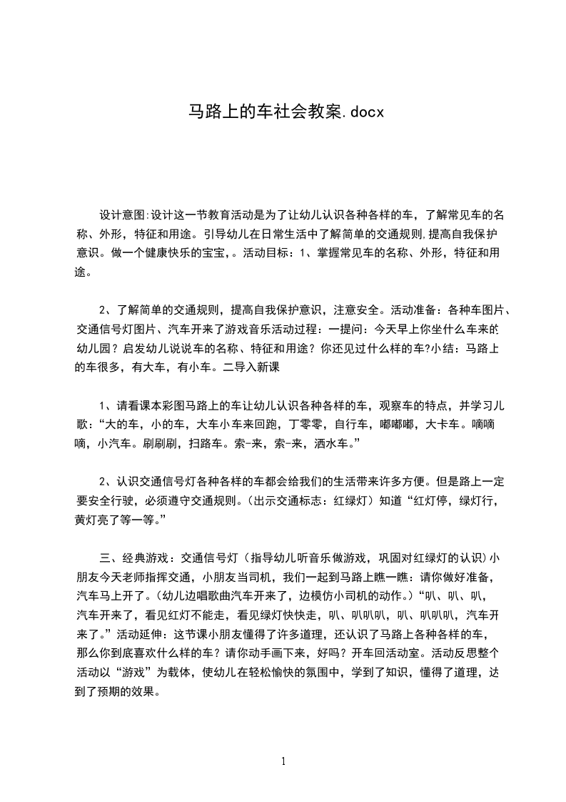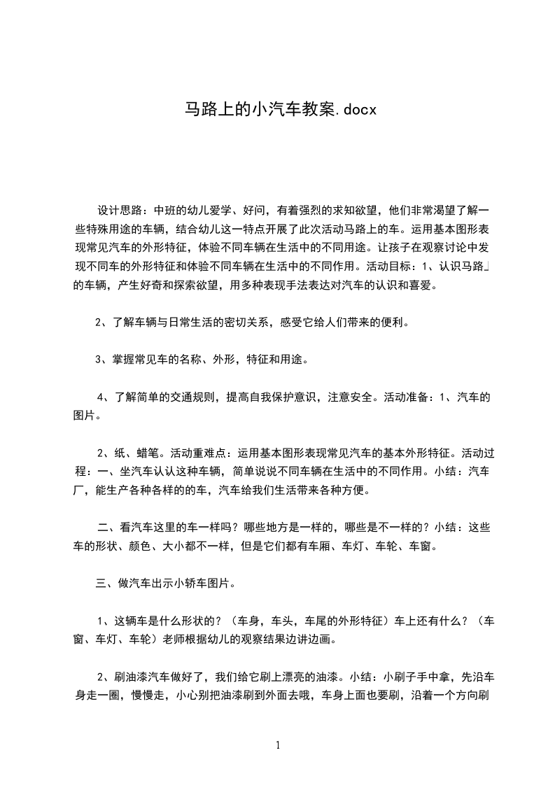 2、通过活动使幼儿感受自己创作中自然、朴实的没,体验成功的喜悦。活动重、难点:想象、创作、制作汽车。活动准备:纸、铅笔、蜡笔、剪刀、糨糊活动过程:一、导入活动,激发幼儿的活动兴趣。介绍每一小组请一个代表介绍小组设计的马路。讨论马路上太空了,缺什么?总结缺汽车
