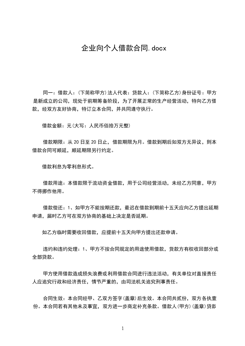 同一:借款人:(下简称甲方)法人代表:贷款人:(下简称乙方)身份证号:甲方是新成立的公司,现处于前期筹备阶段,为了开展正常的生产经营活动,特向乙方借款,经双方友好协商,特订立本合同,并共同遵守执行。