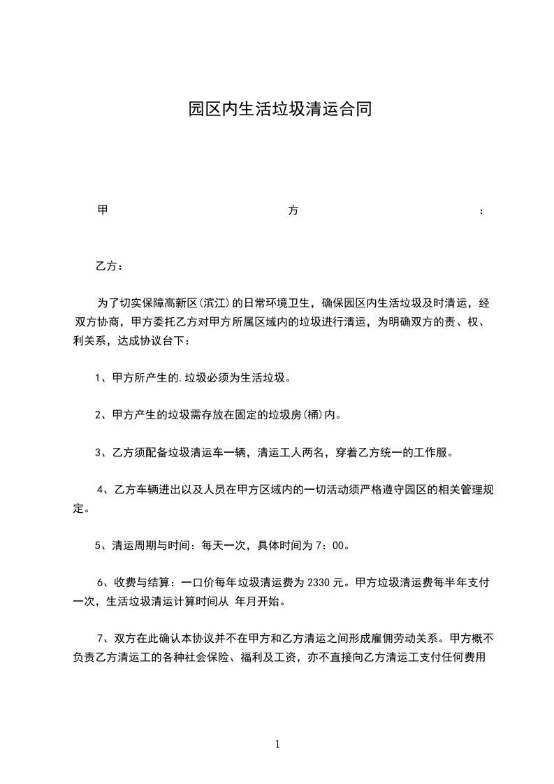 6、乙方清运小区垃圾时间:夏季上午:07:0011:00下午:14:0018:00冬季上午:07:3011:30下午:13:3017:307、垃圾清运工人必须统一着甲方的保洁员工作服,费用自理。乙方工作人员必须将身份证复印件交至*管理处备案。