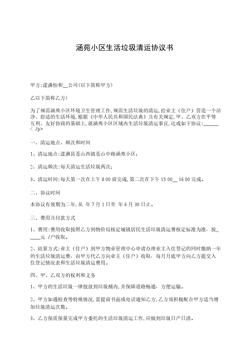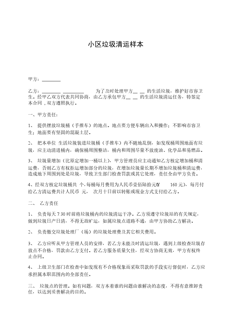 1、乙方未在规定的时间清运完当天的垃圾,甲方在费用结算时按100元/次的标准扣除。