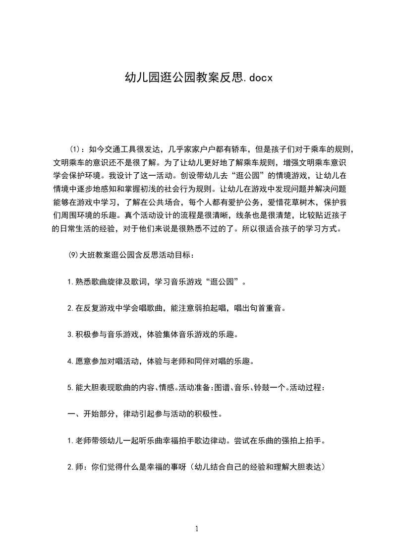 四、结束部分。师:我们玩得可真快乐啊,好,现在回家喽!(活动结束)活动反思:逛公园是一首愉快而又带些诙谐有趣的歌曲,节奏明快,根据活动目标主要是让幼儿注意弱起拍唱,并能拍准重拍,能在重拍处及时带人。在活动中不仅要学唱歌曲还要按照规则游戏,还要注意圆圈的顺逆时针走,对于大班上学期幼儿来说是有一定难度的,掌握的知识点还是蛮多的。这个律动的加入可能会延长课堂时间,如果加入律动,可改为边唱边走,拍准强拍,也可作为课前准备。教师第一次范唱可改为清唱,让幼儿听清楚歌词。钢琴伴奏声音一定要低一些。在游戏中教师一定要清楚强调“带人”的规则在第一强拍处。角色表演唱这部分可放在前面学唱歌曲时,放在后面会影响幼儿游戏的投入。游戏处应注意对幼儿情绪的收放自如,对于猫抓住了老鼠也应给写奖励(贴花纸)。当猫捉老鼠时教师应关注好“爸爸、妈妈、小弟”,从而不至于让他们感到冷场。