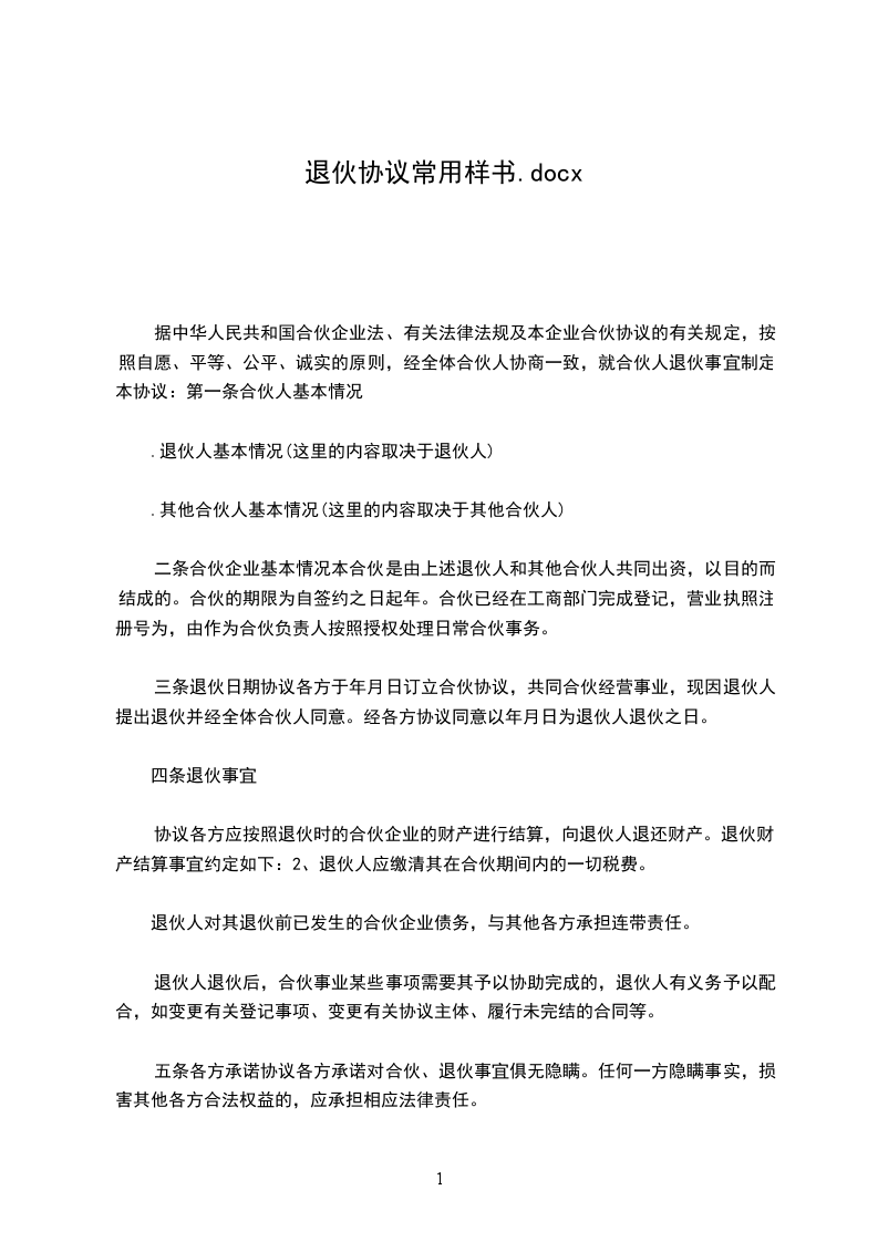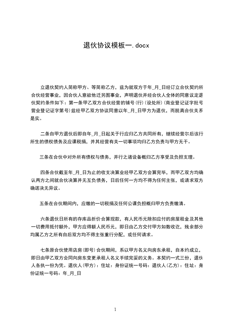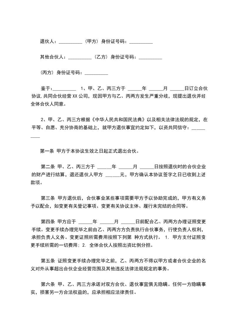 七条原合伙使用店房(即_号),合伙期间系以甲方名义向房东承租,自本约成立,即日由甲乙双方会同向房东变更承租人名义手续完妥的义务。本合同一式三份,退伙人各执一份为凭。退伙人:(甲方)_住址:_退伙人:(乙方)_住址:年_月_日