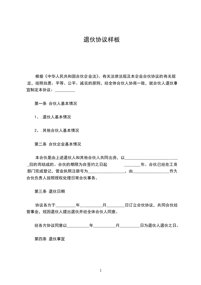 立退伙合同人_简称甲方_、_等简称乙方兹为就双方于_年_月_日经订立合伙合同所合伙经营事业,因合伙人_意欲他迁另图事业,声明退伙并经合伙人全体的同意议定退伙合同条件如下:第一条甲乙双方合伙经营的铺号(_行)(设_处所)(营业执照_字批_号)兹经甲乙双方协议同意以年_月_日甲方为退伙,而脱离合伙关系事实。