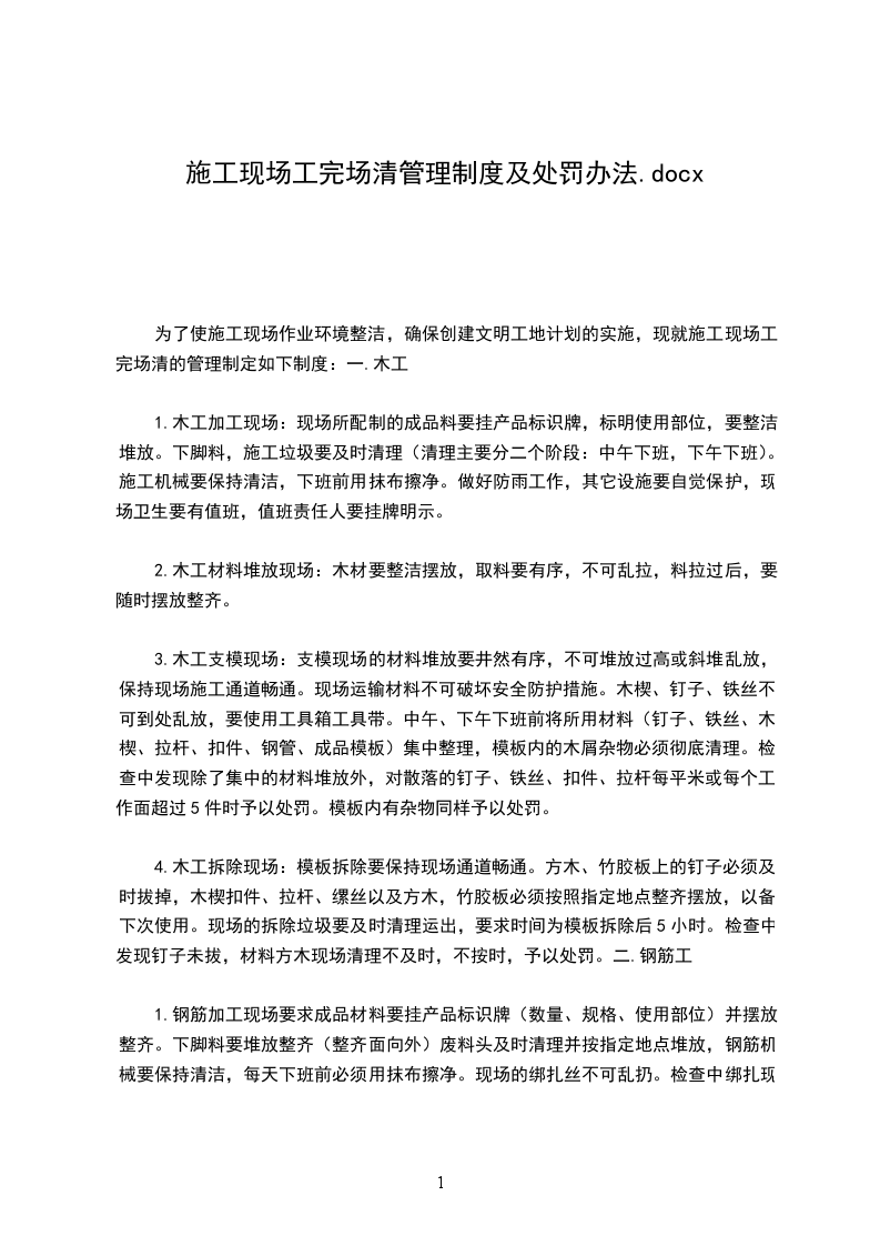 为了使施工现场作业环境整洁,确保创建文明工地计划的实施,现就施工现场工完场清的管理制定如下制度:一.木工