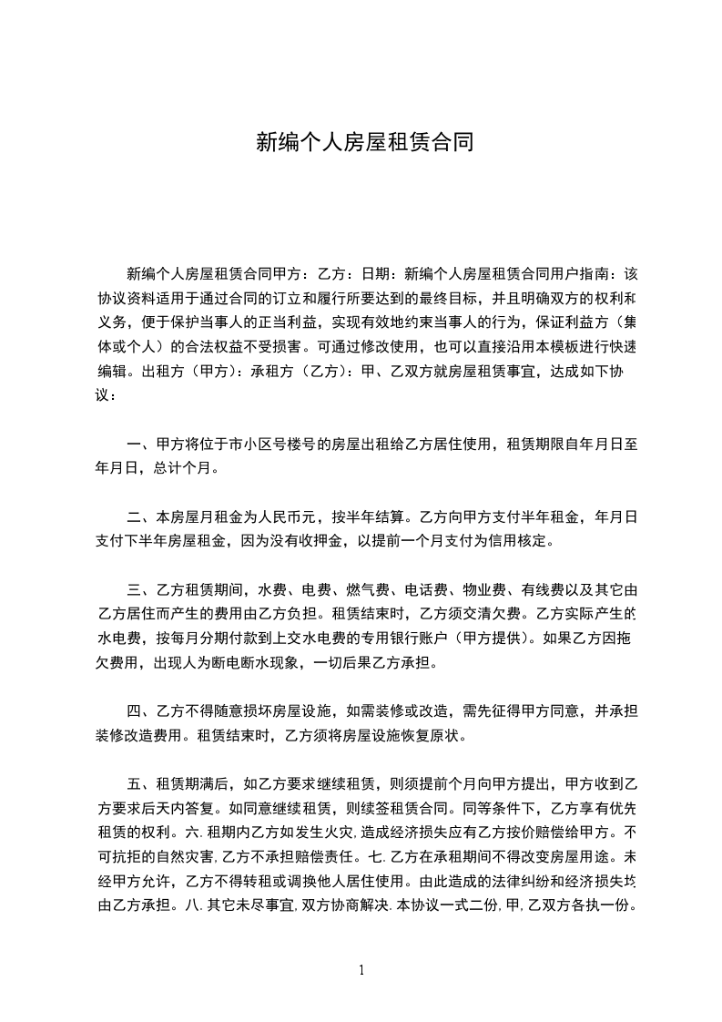 新编个人房屋租赁合同甲方:乙方:日期:新编个人房屋租赁合同用户指南:该协议资料适用于通过合同的订立和履行所要达到的最终目标,并且明确双方的权利和义务,便于保护当事人的正当利益,实现有效地约束当事人的行为,保证利益方(集体或个人)的合法权益不受损害。可通过修改使用,也可以直接沿用本模板进行快速编辑。出租方(甲方):承租方(乙方):甲、乙双方就房屋租赁事宜,达成如下协议: