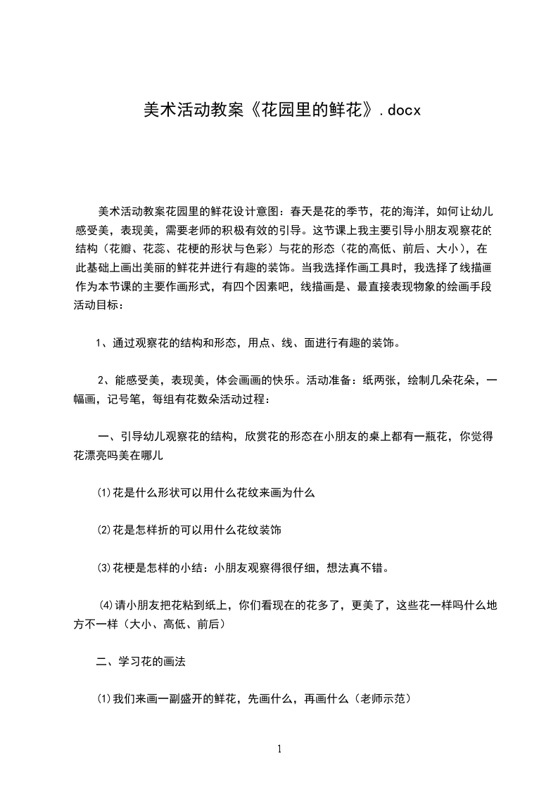 美术活动教案花园里的鲜花设计意图:春天是花的季节,花的海洋,如何让幼儿感受美,表现美,需要老师的积极有效的引导。这节课上我主要引导小朋友观察花的结构(花瓣、花蕊、花梗的形状与色彩)与花的形态(花的高低、前后、大小),在此基础上画出美丽的鲜花并进行有趣的装饰。当我选择作画工具时,我选择了线描画作为本节课的主要作画形式,有四个因素吧,线描画是、最直接表现物象的绘画手段。活动目标: