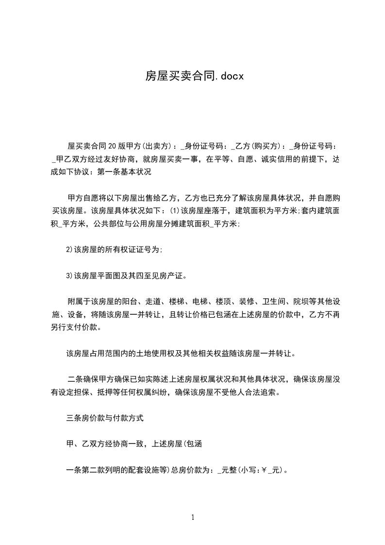 屋买卖合同20版甲方(出卖方):_身份证号码:_乙方(购买方):_身份证号码:_甲乙双方经过友好协商,就房屋买卖一事,在平等、自愿、诚实信用的前提下,达成如下协议:第一条基本状况