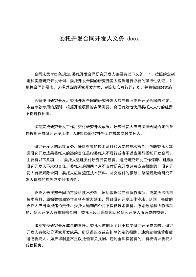 合同法第332条规定,委托开发合同研究开发人主要有以下义务:1、按照约定制定和实施研究开发计划。委托开发合同的研究开发人应当进行必要的可行性认证,并根据合同的要求,选择适当的研究开发方案,制定切实可行的计划,并积极组织实施。