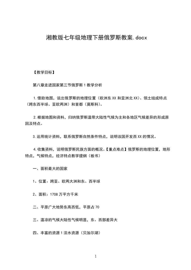 4.收集资料,说明俄罗斯民族方面的概况。【重点难点】俄罗斯的地理位置,地形特点,气候特点,经济特点教学提纲(板书)