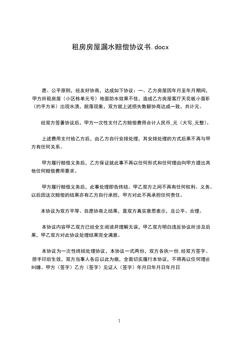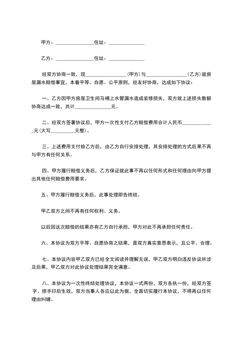 愿、公平原则,经友好协商,达成如下协议:一、乙方房屋因年月至年月期间,甲方所租房屋(小区栋单元号)地面防水效果不佳,造成乙方房屋客厅天花板小面积(约平方米)出现水渍,脱落现象,双方就上述损失数额协商达成一致,共计元。